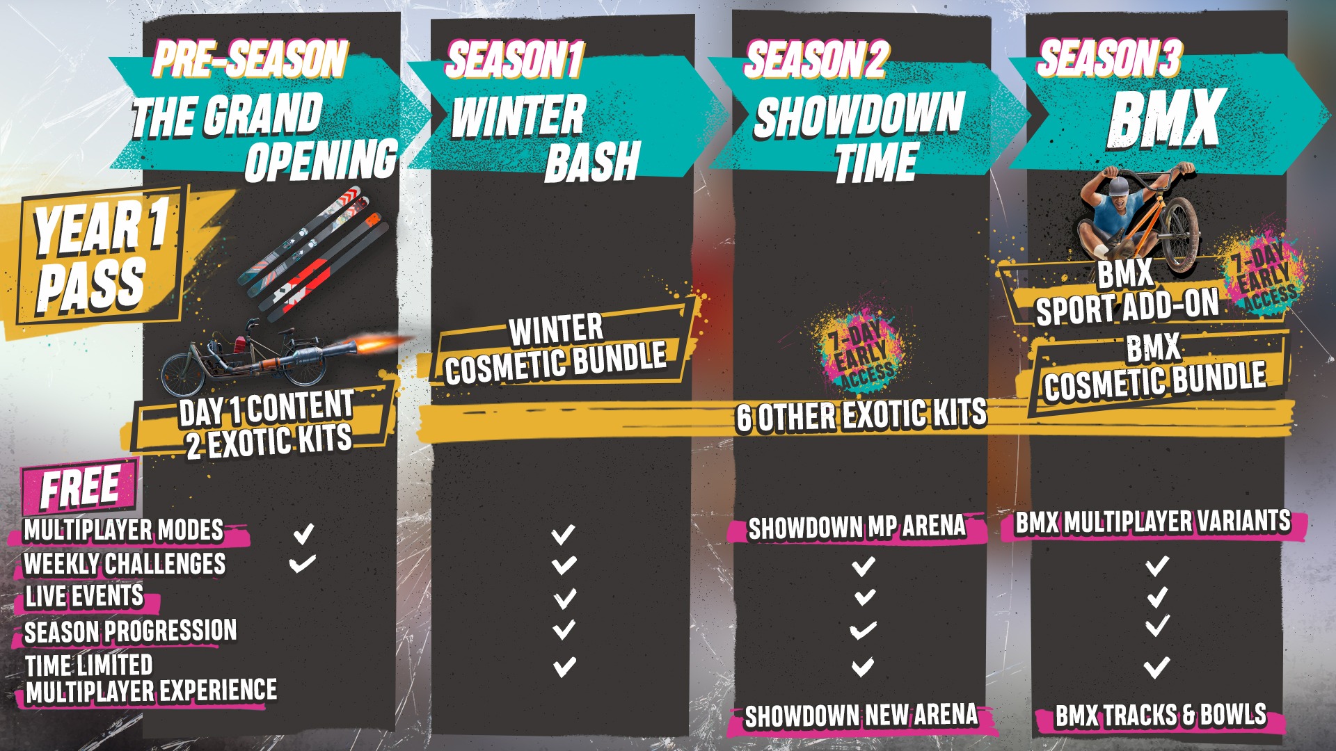 Der Year 1 Pass gewährt an Tag 1 zusätzlich exklusiven Zugang zu den exotischen Sets „Rocket Skis“ und „Rocket Bike“ und einem 7 Tage früheren Zugang zu allen anderen exotischen Sets und dem BMX Add-on.