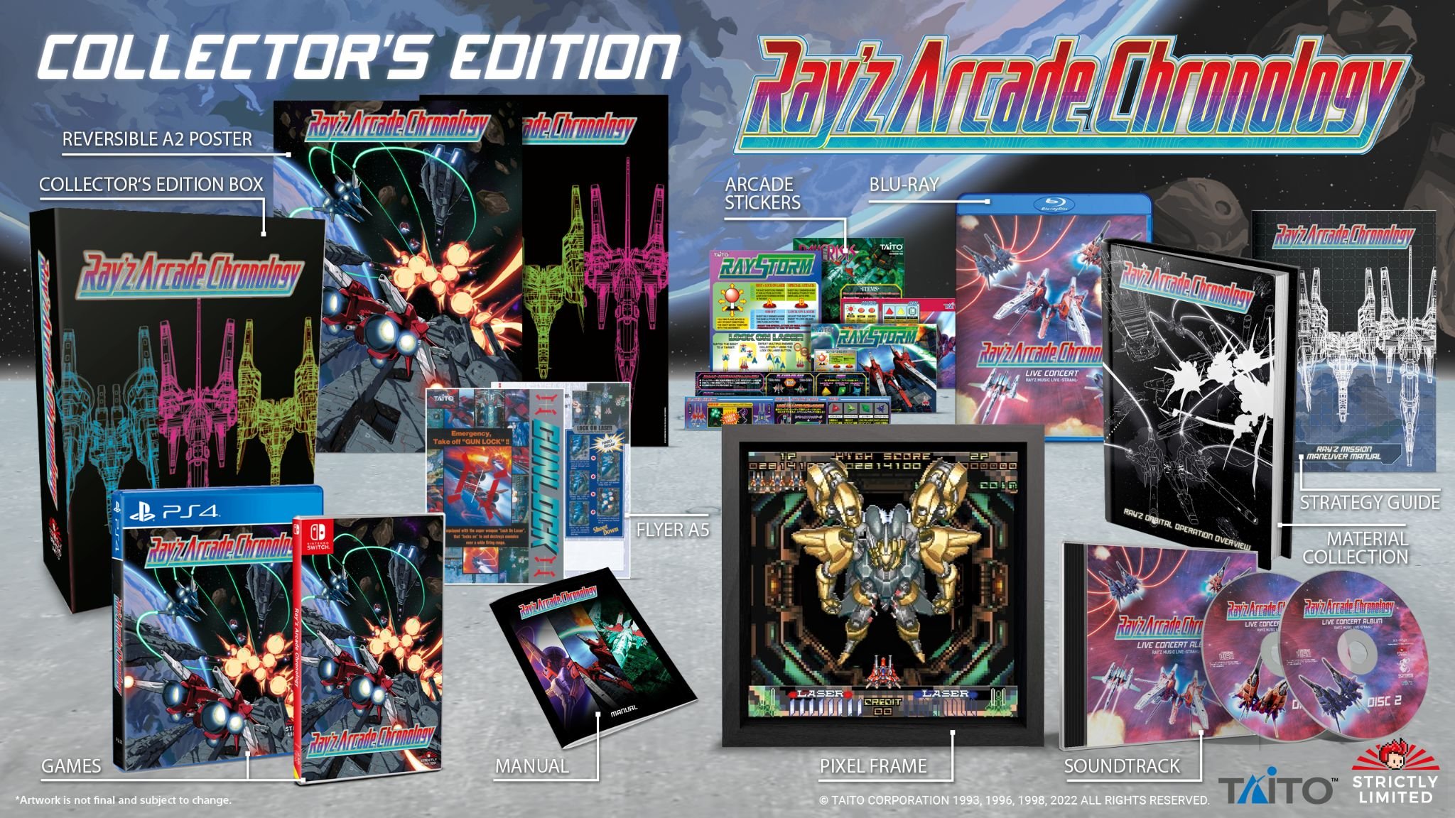Und wem das nicht reicht: Es wird auch noch eine auf 1000 Stück limitierte Disc Fassung von Ray'z Arcade Chronology geben. Neben Stickers, einem Bild, Blu-ray Konzert und Soundtrack wird es nur in dieser Edition den bislang unveröffentlichten Prototypen "R-Gear" geben, der damals der Nachfolger zu RayForce werden sollte. Diese Edition kann man bereits hier vorbestellen (129,99€).