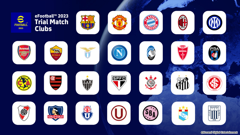 Bisher hatten die Spieler von eFootball die Möglichkeit, einen von neun Partnervereinen auszuwählen, wenn sie offline in "Trial Matches" spielten. eFootball 2023 wird diese Auswahl auf 26 Vereine erweitert, darunter: AC Mailand, FC Internazionale Milano, AS Rom, S.S.C. Neapel, Club America und Santos F.C.
