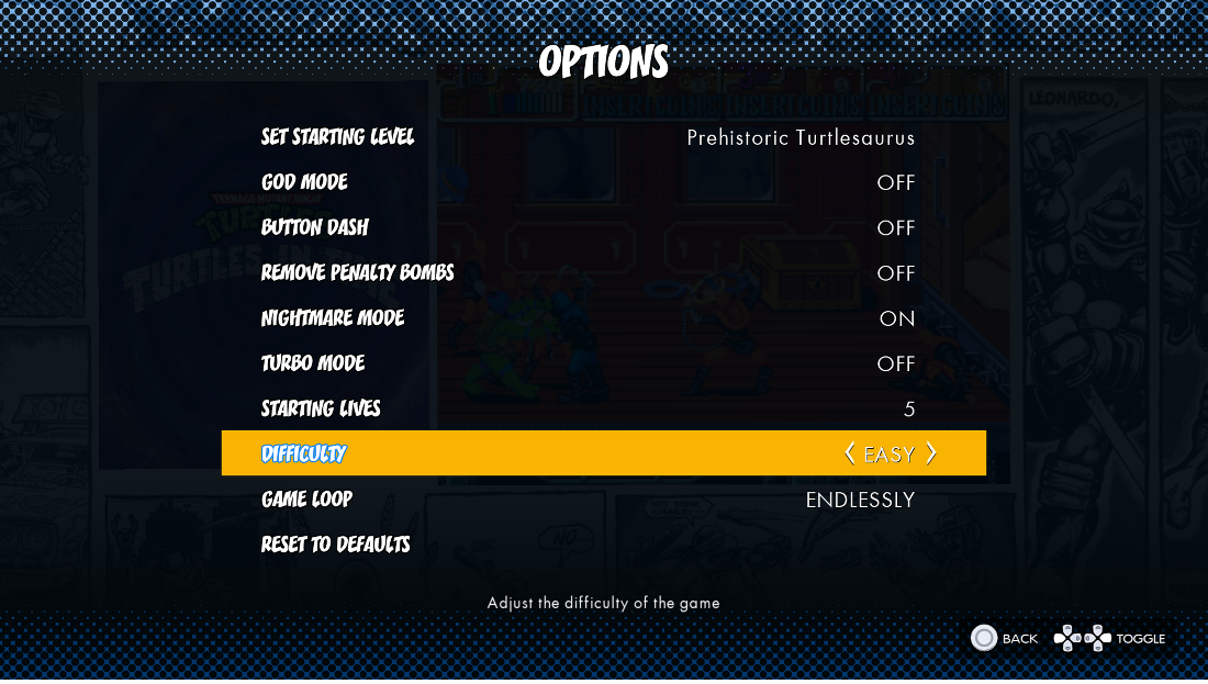 - Eine neue Verbesserung für Arcade US Turtles in Time. Der Game Loop kann jetzt AN / AUS geschaltet werden. Ist es eingeschaltet, beginnt das Spiel nach dem Abspann von vorne.