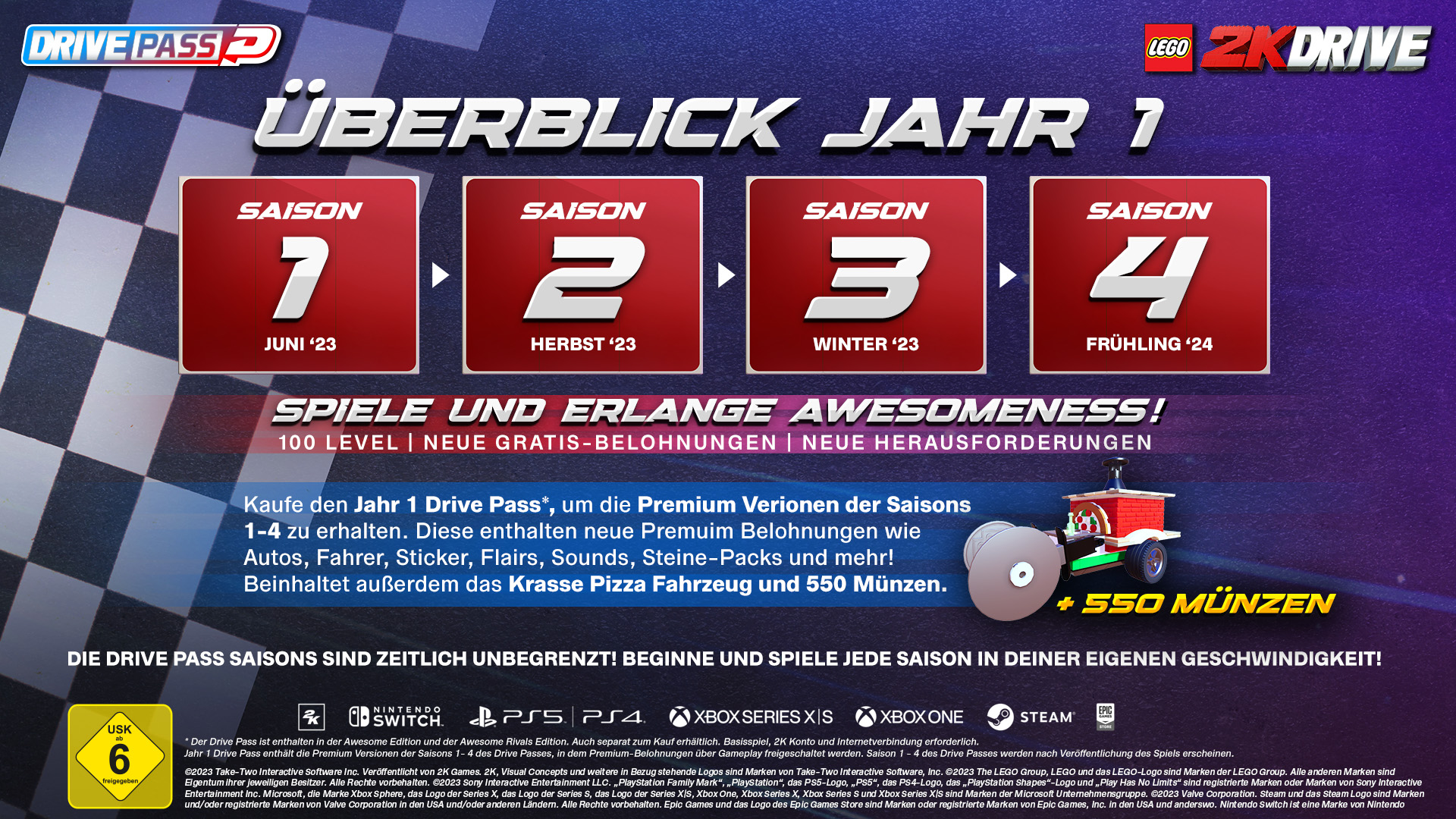 * Drive Pass Belohnungen müssen freigespielt werden. Der Jahr 1 Drive Pass beinhaltet die Premium-Versionen der Saisons 1-4 des Drive Pass, wodurch weitere Premium-Inhalte freigespielt werden können. Der Jahr 1 Drive Pass ist in der LEGO 2K Drive Awesome Edition und Awesome Rivals Edition inkludiert und kann auch separat erworben werden.