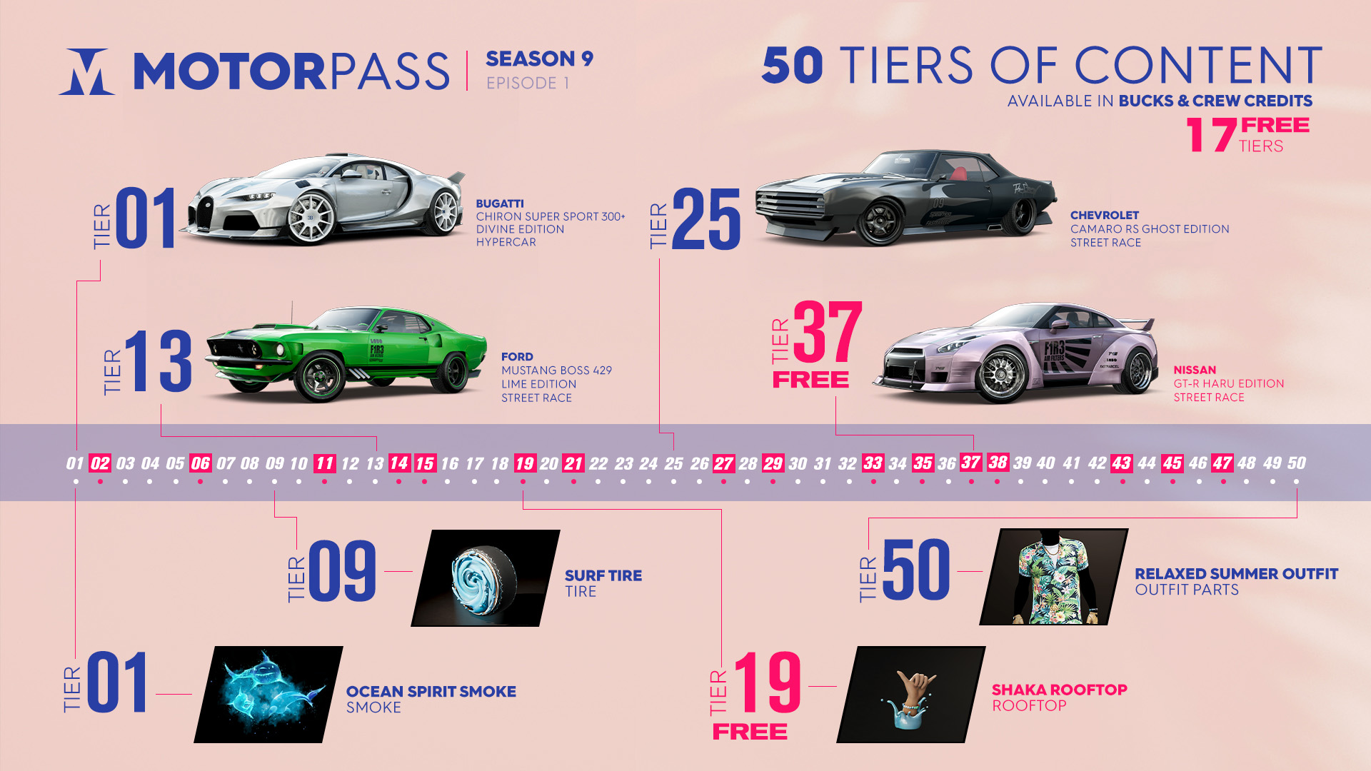 Zum ersten Mal seit Season 5 werden in dieser ersten Episode neue American Legends-Geschichten und -Events eingeführt, die den The Crew 2-Spieler die Möglichkeit geben, auf einer epischen Schatzsuche hinter dem Steuer legendärer Autos wie dem Bugatti Chiron Sport 300+ Divine Edition (Hypercar), dem Ford Mustang Boss 429 Lime Edition (Straßenrennen), dem Chevrolet Camaro RS Ghost Edition (Straßenrennen) oder dem Nissan GT-R Haru Edition (Straßenrennen) durch das Land zu fahren. S9E1 wird auch ein neues Live-Xtrem-Event einführen. Diese Renn-Quests auf dem gesamten US-Festland, und insbesondere das Road to O'ahu-Event mit seinem abschließenden Cinematic, werden neue Details und Hintergrundgeschichten zeigen, die mit dem nächsten Teil der Franchise verbunden sind: The Crew Motorfest.