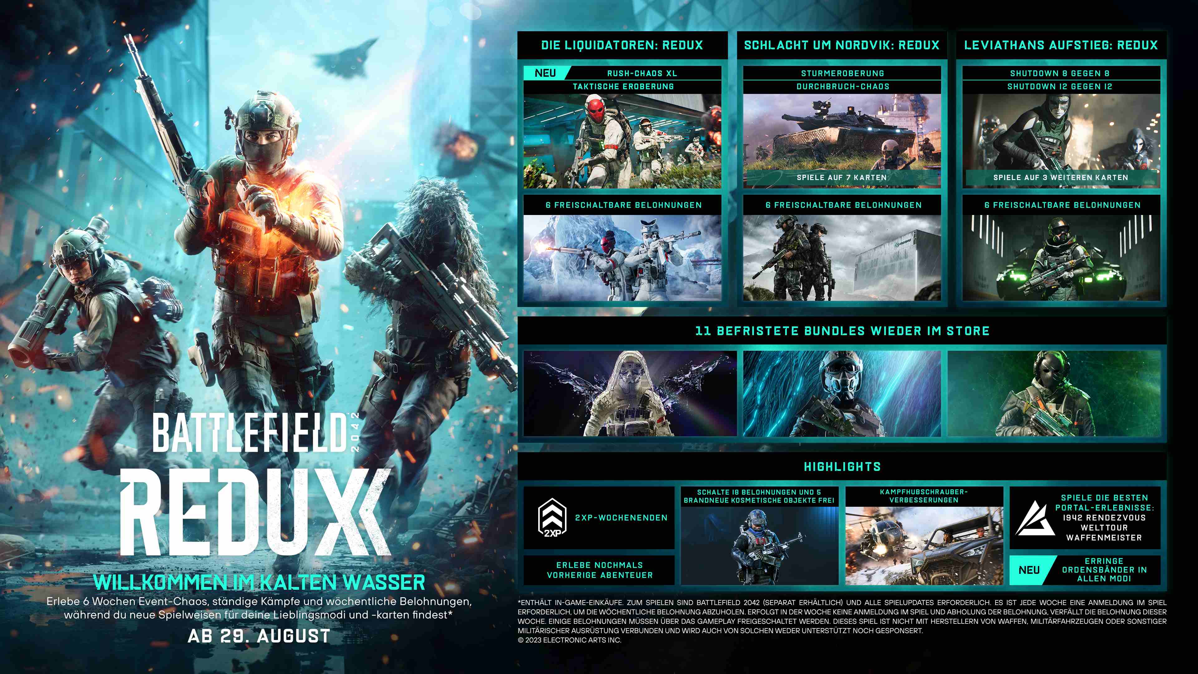 Die Belohnungen in Redux umfassen neue Inhalte wie Charakter-, Fahrzeug- und Waffen-Skins sowie frühere Store-Inhalte, die jetzt erspielt werden können. Neben überarbeiteten Modi und Belohnungen erwarten die Spieler auch Verbesserungen an der Benutzerfreundlichkeit und ein neuer Kodex für alle, die mehr über die Welt von Battlefield 2042 erfahren möchten.