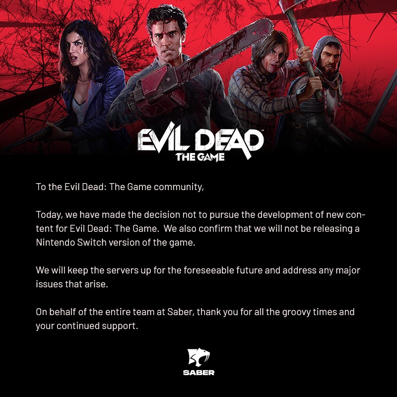 Saber Interactive veröffentlichte via Facebook die Nachricht, dass man keine neuen Inhalte für das asymetrische Multiplayer-Spiel Evil Dead: The Game in Zukunft veröffentlichen wird. Lustig, da das Spiele erst Mitte Mai letzten Jahres erschien.