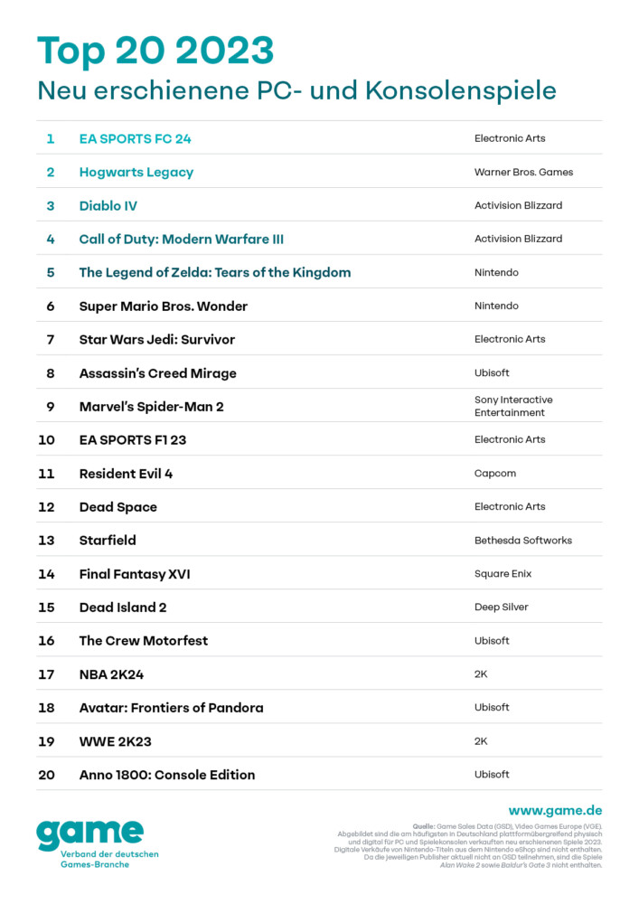 Der Game – Verband der deutschen Games-Branche hat eine Übersicht über die verkaufsstärksten Videospiele im letzten Jahr in Deutschland herausgegeben. Spezifische Größenordnungen werden zwar nicht genannt, aber die Tabelle schließt Download und Disc-Verkäufe gleichermaßen mit ein. Lediglich die Titel Alan Wake 2 und Baldurs Gate 3 tauchen nicht auf, da die Publisher nicht im Verband vertreten sind.