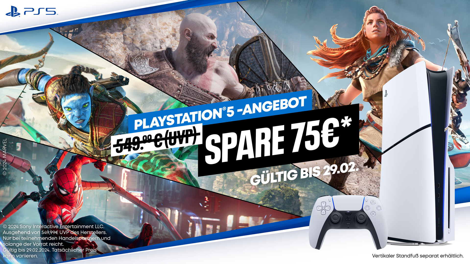 Ab sofort wird PlayStation 5 für begrenzte Zeit vergünstigt angeboten. Bis zum 25. Februar ist die Konsole in Deutschland und Österreich statt für die aktuelle UVP des Herstellers von 549,99 Euro zu einem unverbindlichen Aktionspreis von 474,99 Euro bei direct.playstation.com erhältlich. Zudem wird die PS5 auch im stationären Handel bei teilnehmenden Partnern rabattiert angeboten. Im Handel geht die Aktion bis zum 29. Februar. Dies gilt nur solange der Vorrat reicht, tatsächliche Preise können abweichen und werden durch die Handelspartner bestimmt.