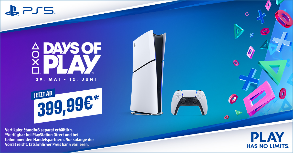 Ab morgen sind im Rahmen der Days of Play zahlreiche Angebote, unter anderem im PlayStation Store, bei direct.playstation.com sowie im Handel verfügbar. Während des Aktionszeitraums können sich PlayStation-Fans auf Herausforderungen, Hardware- und Spieleangebote und weitere Inhalte freuen. Die Angebote gelten vom 29. Mai bis zum 12. Juni.