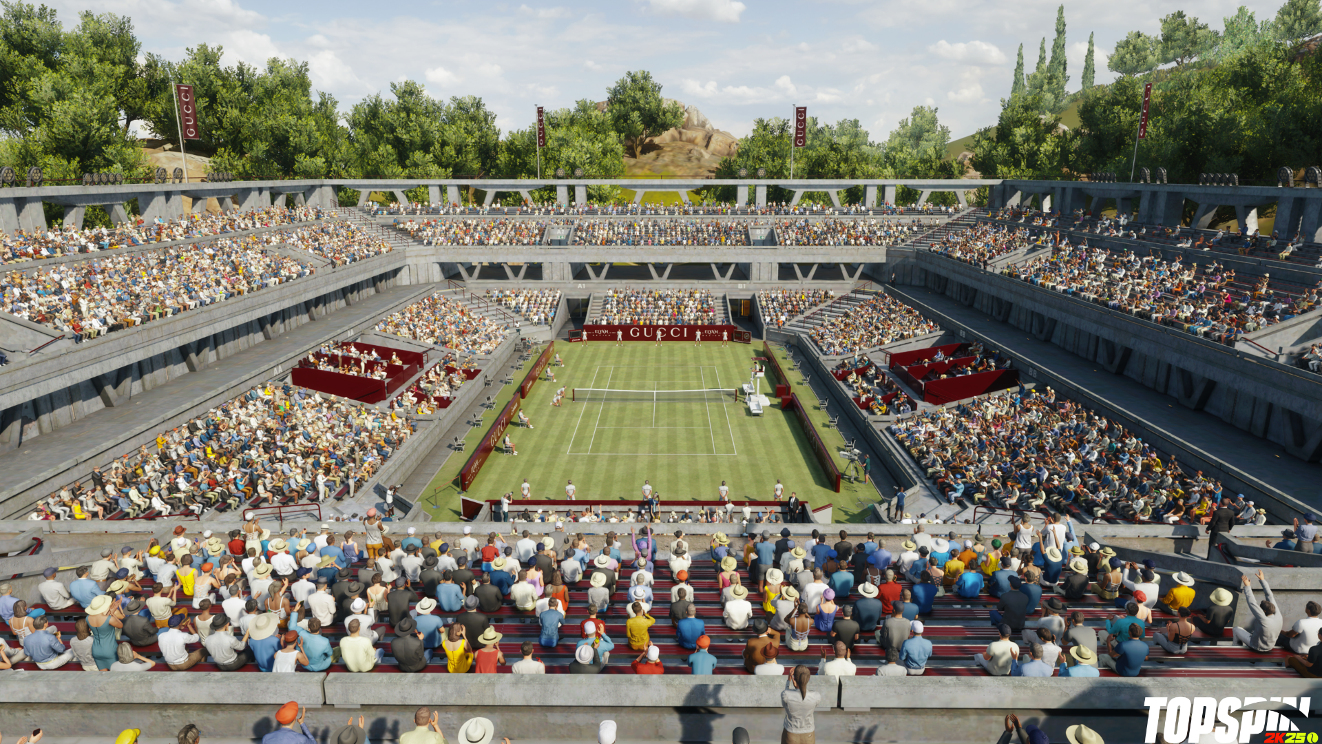 Zusätzlich zur Gucci-Bekleidung und dem spielbaren Jannik Sinner, steht den Spielern ab dem 20. Juni ein in Zusammenarbeit mit Gucci speziell für TopSpin 2K25 entworfener Court zur Auswahl. Der so genannte G-Court ist ein neuer Rasenplatz in Italien mit Gucci-Branding, der im Exhibition-Modus wie auch in der World Tour für einen limitierten Zeitraum beim Gucci Tennis Cup verfügbar ist.