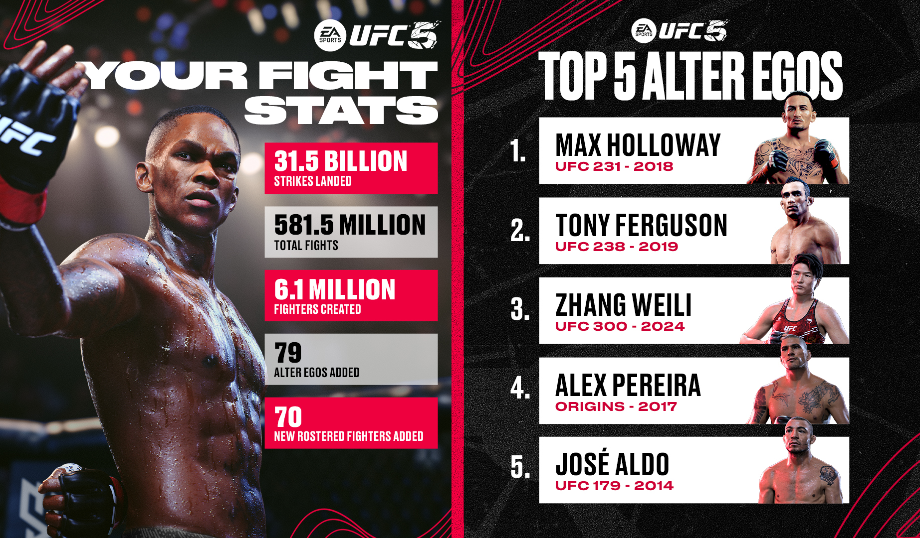 Diese Woche feiert EA Sports UFC 5 sein einjähriges Jubiläum. In dem gesamten Zeitraum seit der Veröffentlichung gab es insgesamt 581,5 Millionen Kämpfe, 31,5 Milliarden gelandete Schläge, 6,1 Millionen erstellte Kämpfer und über 150+ Alter Egos, die hinzugefügt wurden.