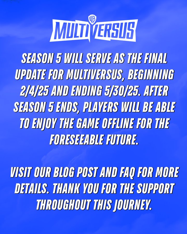 Der actionreiche prügler MultiVersus von WB Games steht erneut vor dem Aus. Nachdem die Beta offline ging und das Spiel erst wesentlich später in der Version 1.0 erschien, ist schon wieder Schluß. Oder besser gesagt nach Season 5. Diese läuft vom 04.02.2025 bis zum 30.05.2025. Danach kann das Spiel nur noch offline gespielt werden.