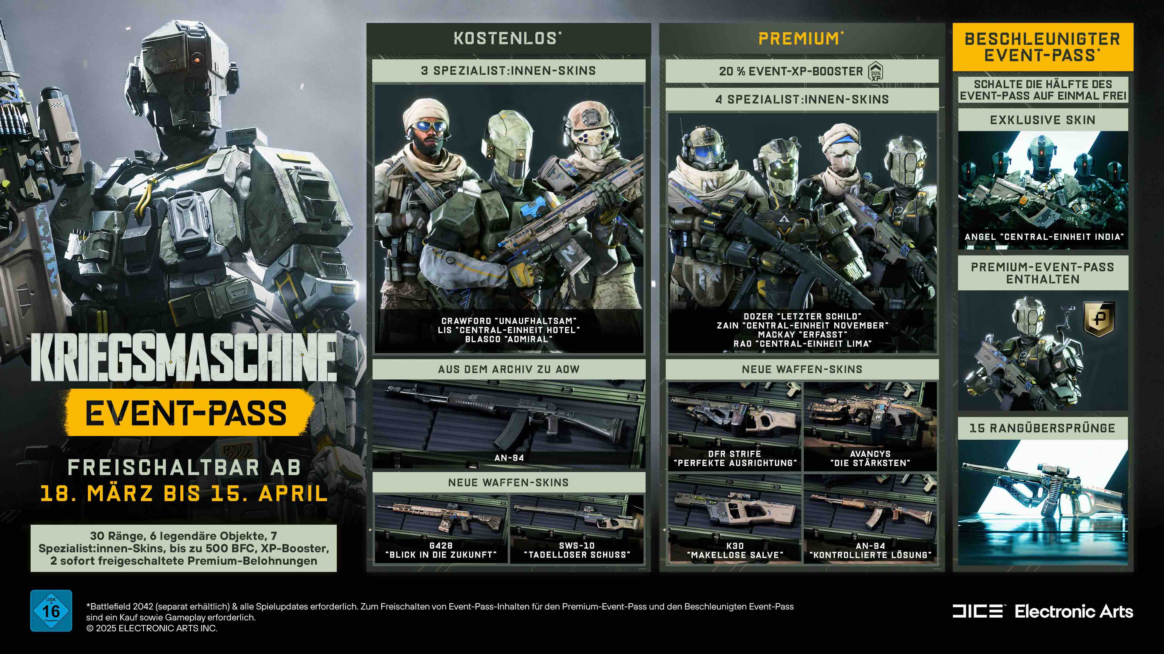 Kriegsmaschine liefert einen neuen Event-Pass für Battlefield 2042, mit dem mehr Objekte freigeschaltet werden können, darunter BFM, legendäre Objekte und sieben neue, einzigartige Spezialisten-Skins. Der Event-Pass enthält 30 Ränge – 15 kostenlos und 15 Premium. Der beschleunigte Event-Pass beinhaltet den Premium-Event-Pass mit 15 Rangübersprüngen und einem exklusiven legendären Skin für Angel.