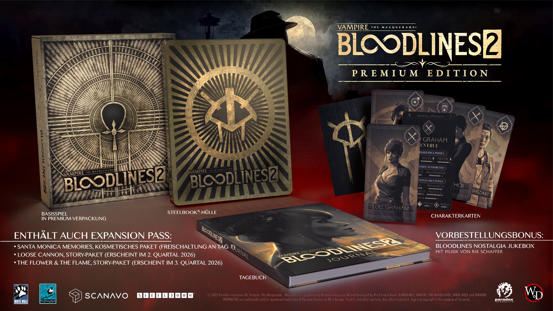 Vampire: The Masquerade – Bloodlines 2 Premium Edition: Basisspiel und der Erweiterungspass mit den „Santa Monica Memories” sowie den Story-Packs „Loose Cannon“ und „The Flower & the Flame“. „Santa Monica Memories“, ein am ersten Tag erscheinendes Kosmetikpaket mit Dekorationsgegenständen, die vom ursprünglichen Kultklassiker Vampire: The Masquerade – Bloodlines inspiriert sind und Phyres Wohnung im Spiel schmücken. „Santa Monica Memories“ kann separat zum UVP von 11,99 € erworben werden. „Loose Cannon“ folgt der brutalen Perspektive von Brujah Sheriff Benny und lässt die Spieler seine Geschichte der unerbittlichen Verfolgung erleben. Spieler, die das Paket kaufen, schalten außerdem ein von Benny inspiriertes Outfit für Phyre frei, wenn „Loose Cannon“ erscheint. „Loose Cannon“ erscheint im 2. Quartal 2026 und kann separat zum UVP von 14,99 € erworben werden. „The Flower & the Flame“ folgt dem legendären Weg der Toreador-Primogen Ysabella zur Schaffung ihres dunklen Meisterwerks. Spieler, die „The Flower & the Flame“ besitzen, erhalten außerdem ein von Ysabella inspiriertes Outfit für Phyre, wenn das Story-Paket erscheint. „The Flower & the Flame“ erscheint im 3. Quartal 2026 und kann separat zum UVP von 14,99 € erworben werden.