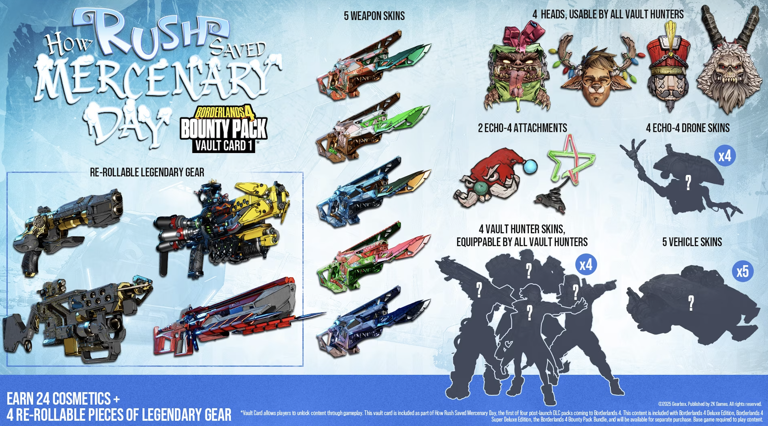 Mit dem ersten Bounty Pack erhalten Fans neue, erzählerisch dichte Zusatzinhalte in kleinerem Format – perfekt, um erneut in die chaotische Welt von Kairos einzutauchen. In mehreren neuen Hauptmissionen schließen sich Spieler:innen mit Rush zusammen, um dem Minister für Kultur der Zeitwächter die wahre Bedeutung des Söldnertags zu zeigen, einer festlichen Zeit des Schenkens, Feierns und gepflegten Geballers mit Freund:innen und Familie. Ganz nebenbei wartet natürlich auch neuer legendärer Loot.
