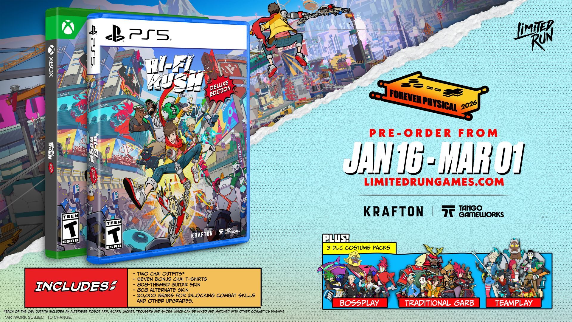 Krafton hat bekannt gegeben, dass die physischen Konsolen-Editionen von Hi-Fi Rush ab sofort vorbestellt werden können. Das Rhythmus-Action-Spiel ist bekannt für seinen einzigartigen Stil, musikgetriebene Kämpfe und seine besondere Animation. Die physische Veröffentlichung erfolgt in Partnerschaft mit Limited Run Games.