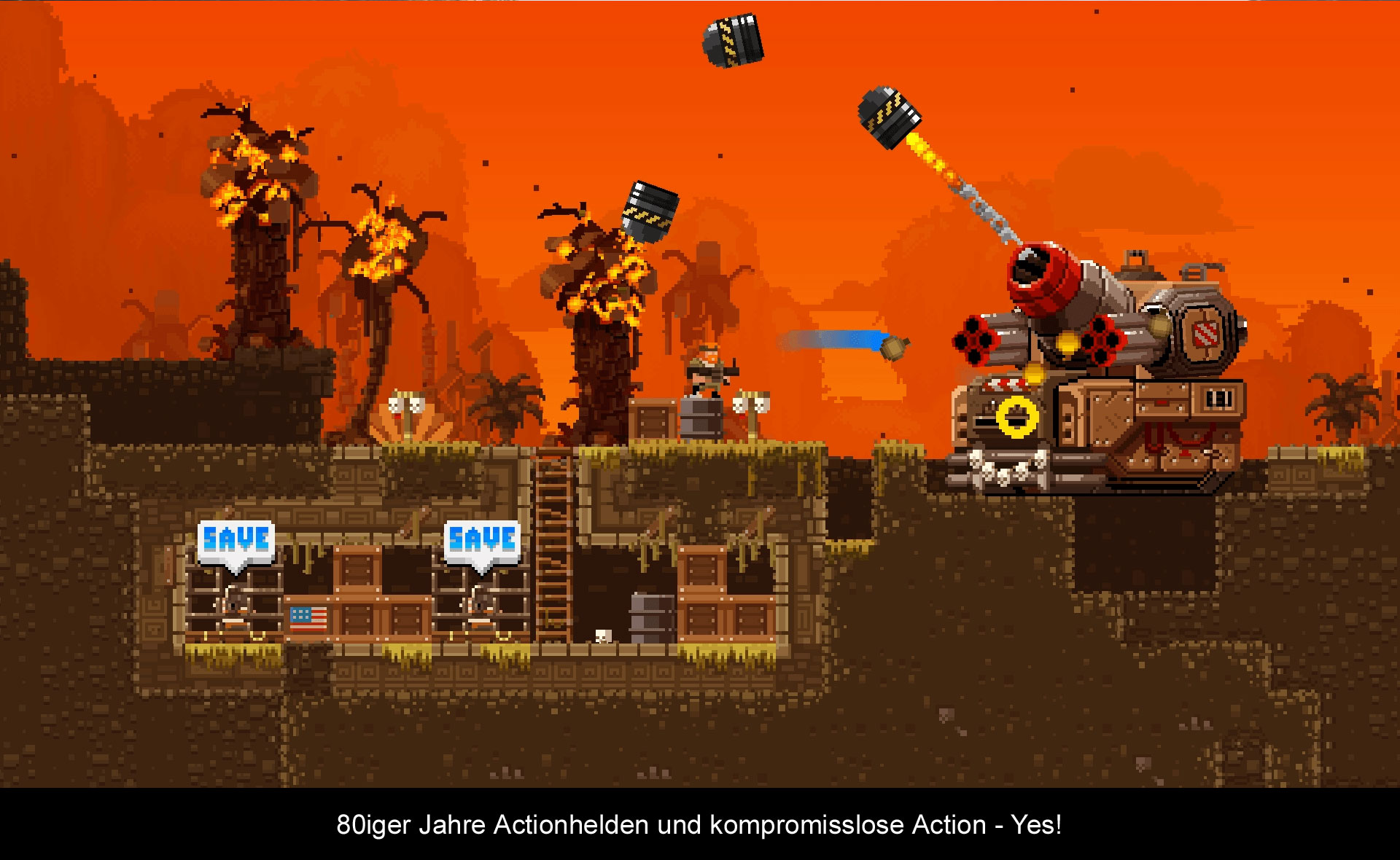 Technisch ist „Broforce“ relativ beeindruckend, da wirklich unheimlich viel los ist auf dem Bildschirm, wenn alles explodiert und Kanonenkugeln hin- und herfliegen. Leider ist die Grafik doch etwas stark pixelig und abstrahiert, was vielleicht nicht jedermanns Sache ist. Dafür läuft das Spiel aber durchgehend stabil.