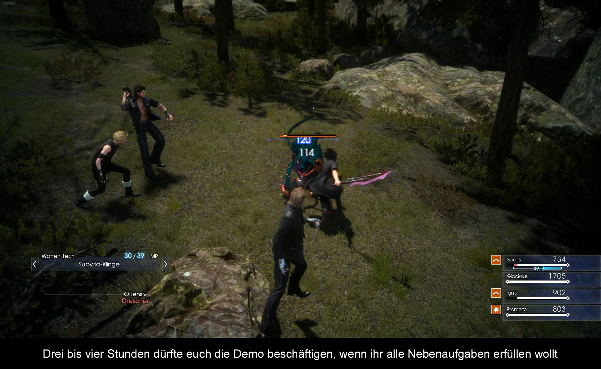 Zur Geschichte von „Final Fantasy XV“ gibt es in der Demo relativ wenig. Wir wissen nur, dass sich der Prinz Noctis mit seinen drei Freunden aus irgendeinem Grund auf den Weg gemacht hat. Nun gibt es aber ein Problem mit dem Fahrzeug und für die Reparatur benötigt man 25.000 Gil und hier steigt die Demo ein. Ihr seid also irgendwo im Nirgendwo und müsst das Geld auftreiben und glücklicherweise treibt ein riesiger Behemoth sein Unwesen und das Erledigen von ihm sichert euch 25.000 Gil. Also macht ihr euch auf die Suche nach dem Monster im Wald, um das Geld zu bekommen.
