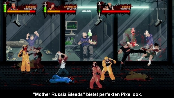 Grafisch gibt es in Mother Russia Bleeds einen tollen Pixellook zu sehen, der einerseits an Streets of Rage, aber auch Hotline Miami erinnert. Letzteres vor allem dank der unglaublichen Brutalität, die nichts für zartbesaitete ist. Aber auch so kann das Spiel mit vielen abwechslungsreichen Umgebungen aufwarten, die zum Teil sehr skurril sind. Zum Beispiel ist man in einem Level in einem sowjetischen SM-Club unterwegs. Das selbe gilt auch für die Gegner, die zwar in unterschiedlichen Größen daherkommen, aber viele unterschiedliche Skins bereithalten. Aber auch musikalisch orientiert man sich an Hotline Miami mit einem coolen elektronischen Soundtrack, der an die 80er Jahre erinnert und durchaus Ohrwurm-Potential hat.