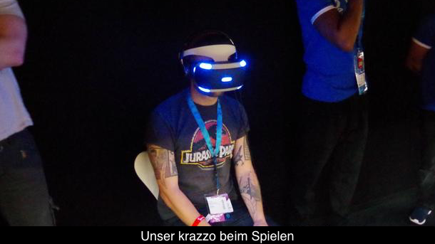 In beiden Fällen konnten wir die aktuellste Revision 2.0 von Project Morpheus testen. Beim Zusehen wirkt das Gerät sehr futuristisch mit seinem weißen Design und den vielen blauen LEDs, die von der PlayStation 4 Kamera verfolgt werden. Zum Gewicht des Gerätes können leider noch keine genauen Angaben gemacht werden, es ist aber keinesfalls zu schwer und dürfte wohl irgendwo unter einem Kilogramm liegen. Das meiste vom Gewicht macht dabei der vordere Teil, die Brille selbst, aus. Theoretisch könnte es dazu führen, dass die Brille auf die Nase drückt, was aber zum Glück nicht der Fall ist. Durch eine intelligente Konstruktion wird das Gewicht angenehm auf dem Kopf verteilt, was wohl auch längere Sessions problemlos möglich machen sollte. Unsere Sessions waren aber nur kurz im Bereich von 10-20 Minuten und so sind nur Mutmaßungen möglich. Apropos intelligente Konstruktion, während man bei der Konkurrenz in Form von Oculus Rift die Brille mit relativ simplen Klettverschlüssen am Kopf befestigt, hat sich Sony einen Mechanismus überlegt, der auf einem Knopf und einem Rädchen basiert. Mit einem Rädchen hinter dem Kopf kann man festlegen, wie eng die Brille am Kopf liegt. Mit dem Knopf vorne an der Brille lässt sich die Brille leicht nach vorne bzw. hinten schieben, um den Abstand zu verändern und so die Schärfe einzustellen. Beides funktioniert kinderleicht und lässt sich problemlos selbst bewerkstelligen, was bei der Oculus Rift nicht so leicht möglich war. Zum Absetzen gibt es noch einen weiteren Knopf, der dann sofort das Gerät auf ganz weit stellt, damit man es problemlos absetzen kann. Übrigens müssen sich Brillenträger keine Sorgen machen, denn selbst mit einer sehr großen Brille, gab es keine Probleme beim Tragekomfort, was bei der Konkurrenz nicht funktioniert hat. Während der erste Test in einer dunklen Umgebung stattfand, spielten wir beim zweiten Mal in einem hell ausgeleuchteten Raum und da schien unterhalb der Nase etwas Licht ins Gerät. Dies war vor allem zu Beginn etwas nervig, hat beim Spielen aber nicht weiter gestört. Bei dunklen Spielen könnte es aber zu Problemen führen.