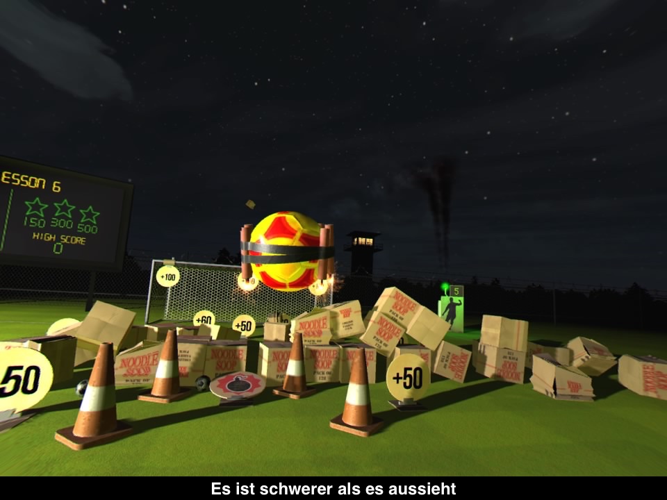 In Headmaster seid ihr ein aufstrebendes Talent, welches an einer Fußball-Akademie zum nächsten großen Star werden soll. Dazu dürft ihr allerlei Übungen absolvieren, die sich alle mit Kopfbällen beschäftigen. Von irgendwo kommt ein Fußball geflogen und eure Aufgabe ist es dann diesen mit eurem Kopf ins Tor zu befördern. Das ist aber noch nicht alles, denn überall gibt es Ziele und je schwieriger das Ziel zu treffen ist, desto mehr Punkte gibt es für euch. Mit einer bestimmten Punktzahl könnt ihr dann die nächste Übung freischalten. Was relativ einfach klingt, ist teilweise sehr schwer. Denn die Physik ist relativ lebensecht und so erfordert es einiges an Übung die Bälle gezielt in die Ecke zu manövrieren. Wer sich schon mal im echten Leben an Kopfbällen versucht hat, weiß wie schwer es ist. Zudem wird das Spiel von Übung zu Übung schwieriger. Plötzlich gibt es bewegliche Ziele, einen Papptorwart oder Bombenbälle. Ja, Bombenbälle. Denn Headmaster nimmt sich zu keinem Zeitpunkt wirklich ernst und lockert das Spielgeschehen immer mal wieder mit seinen lustigen Charakteren und verrückten Aufgaben auf. Mal darf man Bier-Pong spielen und ein anderes mal Basketbälle versenken. Der Humor erinnert dabei immer mal wieder an Portal. Insgesamt gibt es 40 Level und vier Examen mit jeweils drei Sternen zu holen. Man kann das Spiel aber auch zu sechst im Party-Modus spielen. Hierbei wird das Headset herumgereicht und man kämpft um die beste Punktzahl.