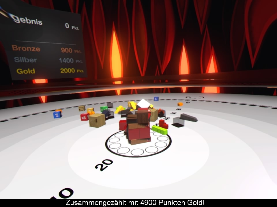 Das Grundprinzip von "Tumble VR" ist, möglichst elegant so viele Steinchen wie möglich auf einer Plattform zu platzieren. Je nach Vorgabe geht es entweder darum, stur einen Stein auf den anderen zu setzen, um möglichst hoch zu kommen oder einfach so viele Bauklötze wie möglich systematisch auf einer Plattform abzulegen. Dabei bestehen die Bauklötze nicht nur aus verschiedenen Materialien wie Plastik, Glas, Stein, Holz, Schaumstoff oder Gummi inklusive deren Eigenschaften, sondern auch aus verschiedenen Formen wie Quader, Zylinder, Pyramiden und Halbkugeln. Als wäre es nicht schon schwer genug eine ruhige Hand zu behalten, fügte man zudem noch viele verschiedene und vor allem gemeine Umwelteinflüsse hinzu. Das reicht von schrägen Plattformen, bis hin zu Erdbeben, Kanonen oder sich hin und her bewegenden Hindernissen. Neben dem Platzieren von Bausteinen, bietet "Tumble VR" aber noch allerhand weitere Aufgaben für euch. Da gibt es noch Level, wo man mittels Bombentürme gekonnt zum Einsturz bringen muss, oder ebenfalls mittels Bomben einen Ball durch ein Labyrinth befördert. Des Weiteren gibt es noch Herausforderungen, wo man Brücken baut oder ihr eure grauen Zellen in vielen Logikrätseln anstrengen müsst, wo es gilt, einen Laserstrahl mit Spiegeln durch ein Level zu lenken. "Tumble VR" bietet zudem einen Zweispielermodus, welcher von der Idee her zwar vielversprechend daherkommt, spielerisch aber eher unausgegoren daherkommt. Während der Spieler mit dem Headset gewohnt Steinchen stappelt, versucht der andere dem Türmchenbauer das Leben schwer zu machen. Leider hat der Spieler mit dem Headset fast keine Chance, den fiesen Angriffen des anderen zu entgehen.