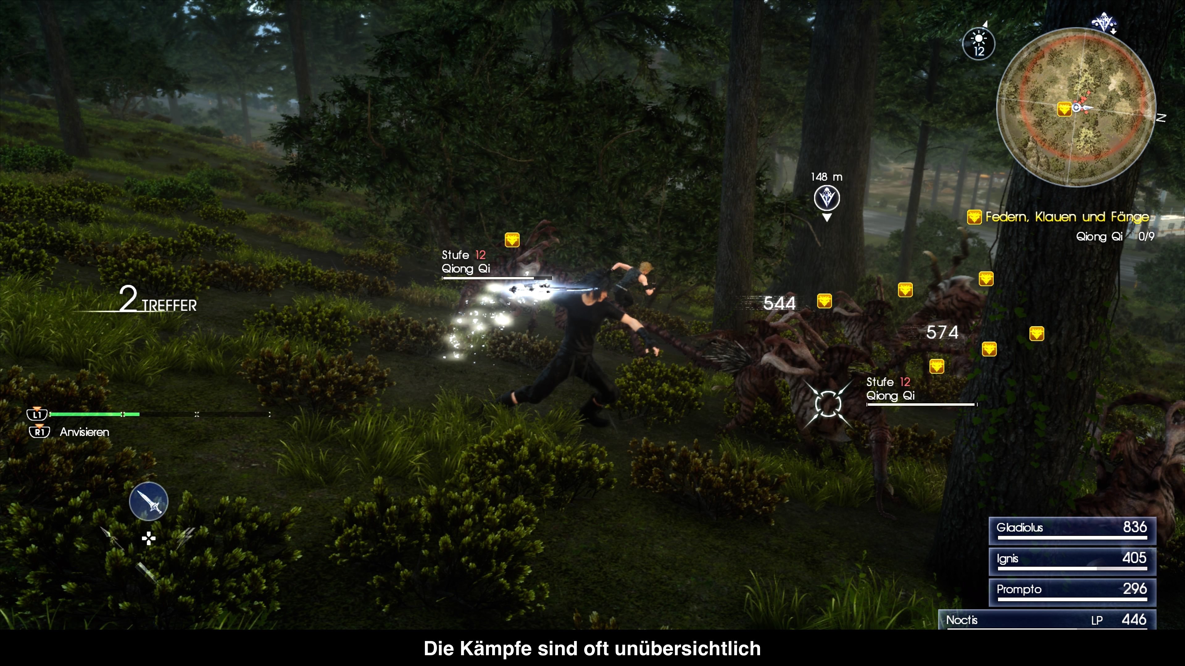 Statt eines rundenbasierten Kampfsystems wie in früheren Spielen, orientiert sich Final Fantasy XV eher an Spielen, wie Devil May Cry. Es geht also sehr actionreichen zu. Dazu gibt es im Kern zwei wichtige Tasten. Die Quadrat-Taste ist zum Blocken bzw. Ausweichen da. Man kann sie gedrückt halten, um Angriffen auszuweichen, wobei dies MP verbraucht. Die zweite Taste ist die Kreis-Taste. Hiermit kann man angreifen und wer möchte kann die Taste durchgehend drücken, um auch durchgehend anzugreifen. In Verbindung mit dem Analogstick kann man so ein paar unterschiedliche Angriffe ausführen, die sich zu Combos aneinander reihen lassen. Ansonsten kann man in der Combo die Waffe wechseln oder sich zu Gegnern oder höher gelegenen Punkten warpen, um dort seine HP und MP aufzufrischen. Bis hierhin klingt es ganz gut, doch so action-getriebene Spiele leben von einem guten Lock-On und Kamerasystem. Beides bietet Final Fantasy XV leider nicht. Denn das Lock-On verliert ständig seinen Lock, sobald man niedergeworfen wird oder sonst etwas passiert. Letztlich verzichtet man irgendwann darauf, weil es eh gleich wieder abgeschaltet wird vom Spiel. Außerdem funktioniert der Wechsel zwischen den anvisierten Gegner eher schlecht als recht. Wirklich schlimm ist jedoch die Kamera. So wird das Spielgeschehen ständig von Büschen und Bäumen in der Welt verdeckt und in etwas engeren Dungeons spielt die Kamera völlig verrückt. Später im Spiel gibt es einen Kampf, der ziemlich episch sein soll, durch die Kamera aber einfach chaotisch wird. Das gilt aber für die meisten Kämpfe, vor allem wenn mehrere Gegner gleichzeitig gegen euch kämpfen. Problem hierbei ist das man den Gegner zum Teil gar nicht anmerkt, dass sie nun zum Angriff ausholen. Da wackelt ein Bison schon mal mit dem Kopf und man selbst liegt tot auf dem Boden. Viel mehr brauchen die Gegner nicht, um euch anzugreifen.
