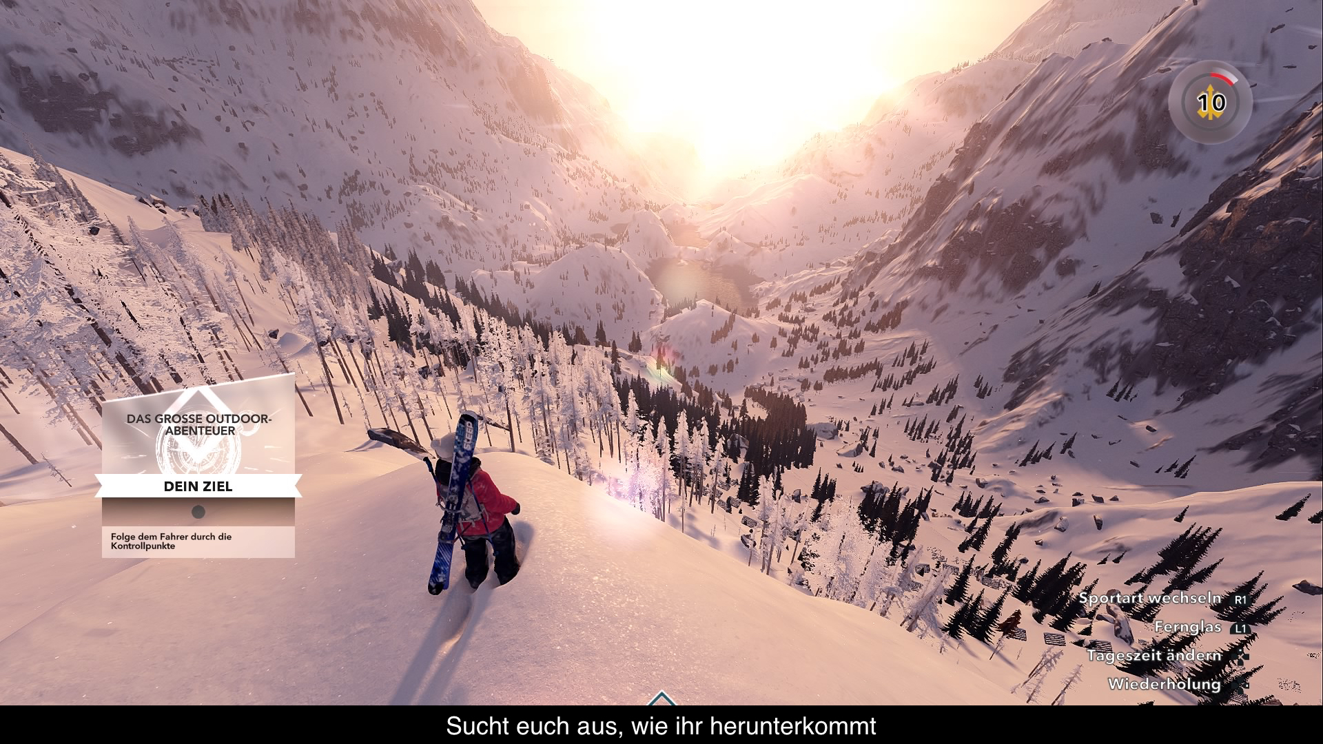 Mag sein, dass jetzt so mancher an dieTheaterweltdenkt, doch hier sind die zahlreichen Ski undSnowboardsgemeint.Steepbietet ganze fünf Fortbewegungsmöglichkeiten in den Bergen, sechs wenn man den Helikopter, welcher einem zum Startpunkt bring, mitrechnet. Um einen Hang zu bezwingen stehen dem Spieler Ski wie auch einSnowboardzur Auswahl. Die Ski sind wesentlich wendiger und schneller, haben aber Nachteile bei der Stabilität. DasSnowboardhingegen ist langsamer, aber besser geeignet um Tricks sicher zu landen. Die Lüfte erkundet man mit einemWingsuitoder demParagleiter. Wer selber gerne durch die Welt wandert, kann diese auch zu Fuß erkunden, sehr langsam und bis auf die Landschaft sehr unspektakulär. Gewechselt wird über einSchnellauswahlrad. Leider ist es nicht möglich in mitten der Bewegung zu wechseln. Man muss still stehen um Aktionen durchzuführen. Ein kleines Manko, wenn man verschiedene Sportarten zum ultimativen Stunt verbinden will. Diese Einschränkung liegt vor allem daran, dass man einen realistischeren Zugang gewählt hat. Vom realistischen Zugang bei den Tricks hat man sich mit dem Update 1.03 verabschiedet. Das kompletteTricksystemwurde überarbeitet, was dieCommunityetwas spaltete. Benötigte man vorher mehr Timing, kann man jetzt schon vor dem Absprung festlegen in welche Richtung man sich drehen will. Dies ermöglicht nun etwas spektakuläre Tricks als es vorher möglich war. So manchen stört es, macht aber Abfahrten etwasspannenderund spektakulärer. Möglichkeiten um sein Können zu beweisen gibt es genug. Über 100 Herausforderungen stehen zur Verfügung, von Punkt zu Punkt Rennen bis zu Trick-Meister. Die Herausforderungen wechseln immer zwischen den verschiedenen Sportarten und das stets wechselnde Terrain der Berge macht jede Abfahrt anders.