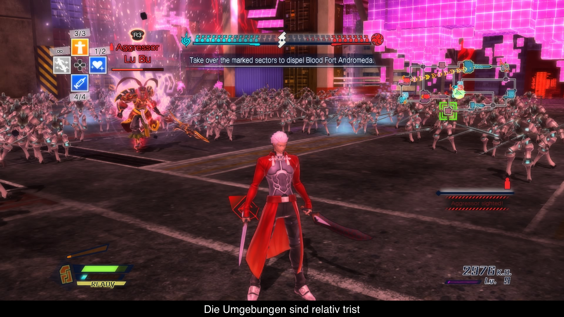 Mehr Positives wird man nicht mehr finden, da es eine Vielzahl an negativen Punkten gibt. Starten wir mit der Zielerfassung. Einen Boss zu erfassen ist so gut wie unmöglich, denn das System scheint diesen Befehl immer zu ignorieren. Dies ist noch ein Punkt, denn man mit der Zeit umzugehen lernt, die anderen hingegen nicht. Im Gegensatz zu den einfachen Fußsoldaten halten Bosse einiges mehr aus. Die Lebensleiste zu minimieren ist ein langes Unterfangen, wo man allzu oft auf billige Tricks zurückgreifen muss, wie die Spezialleiste zu füllen um denselben Angriff immer und immer wieder auszuführen. Auch die KI Mitstreiter sind hier keine Hilfe. Während man mit den Bossen kämpft, verliert man ein Gebiet nach dem anderen. Diese Terretorien fallen viel zu schnell und ohne große Gegenwehr. Selbst die eigenen Servents sind hier keine Hilfe und werden zu schnell vom Gegner besiegt. Bezüglich Gegner Vielfalt gibt es auch nur die Note Mangelhaft. Es gibt gefühlte fünf Klassen auf dem Spielfeld. Neben der grafischen Gestaltung unterscheiden sich diese nur durch den Schaden, die sie verursachen. Diese negativen Punkte, gepaart mit den immer gleichen Missionskarten zehren gewaltig am Spielspaß und an der Langzeit Motivation. Da hilft es auch nichts, dass man Nebengeschichten von anderen Servents vorhanden sind.
