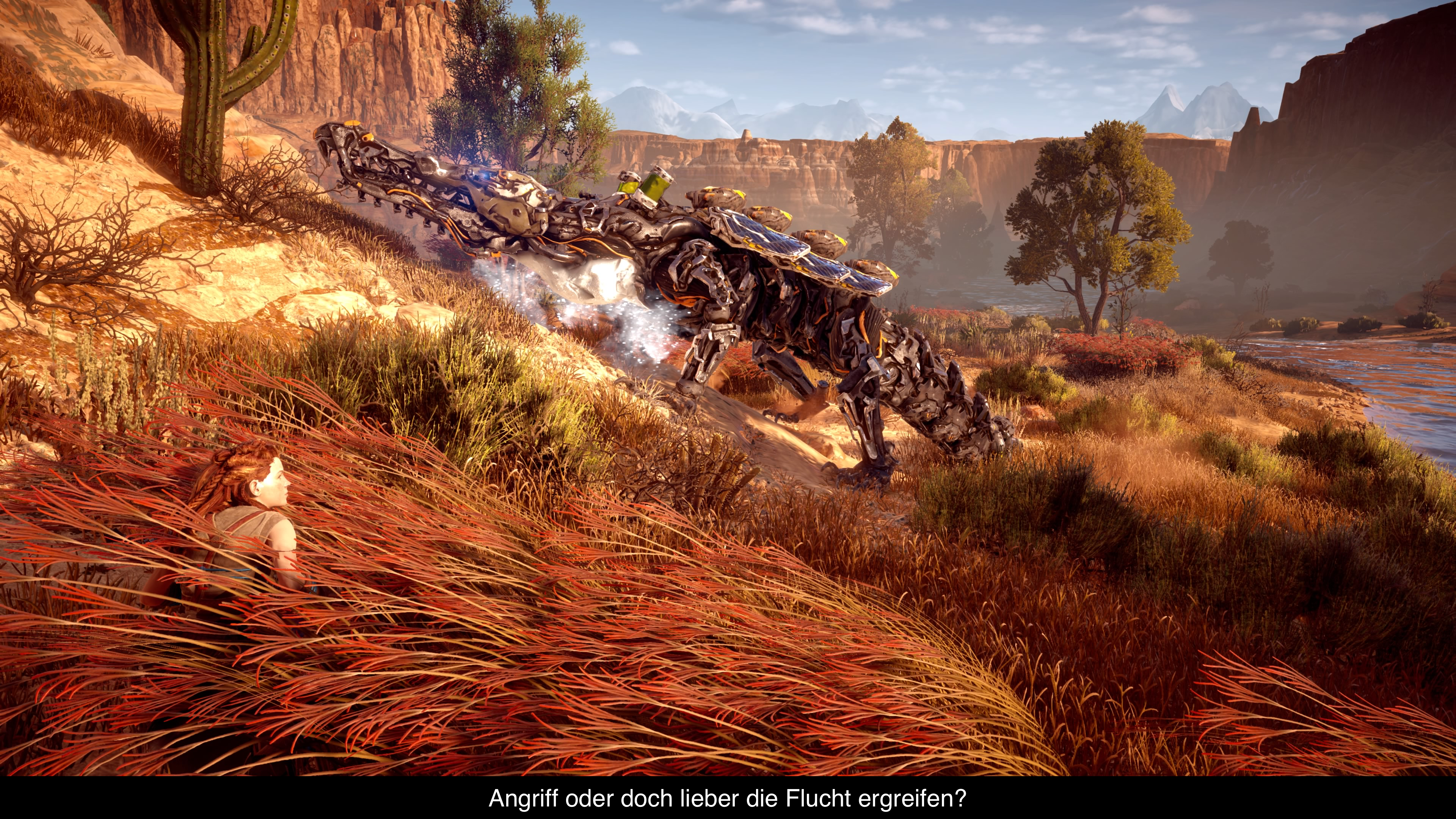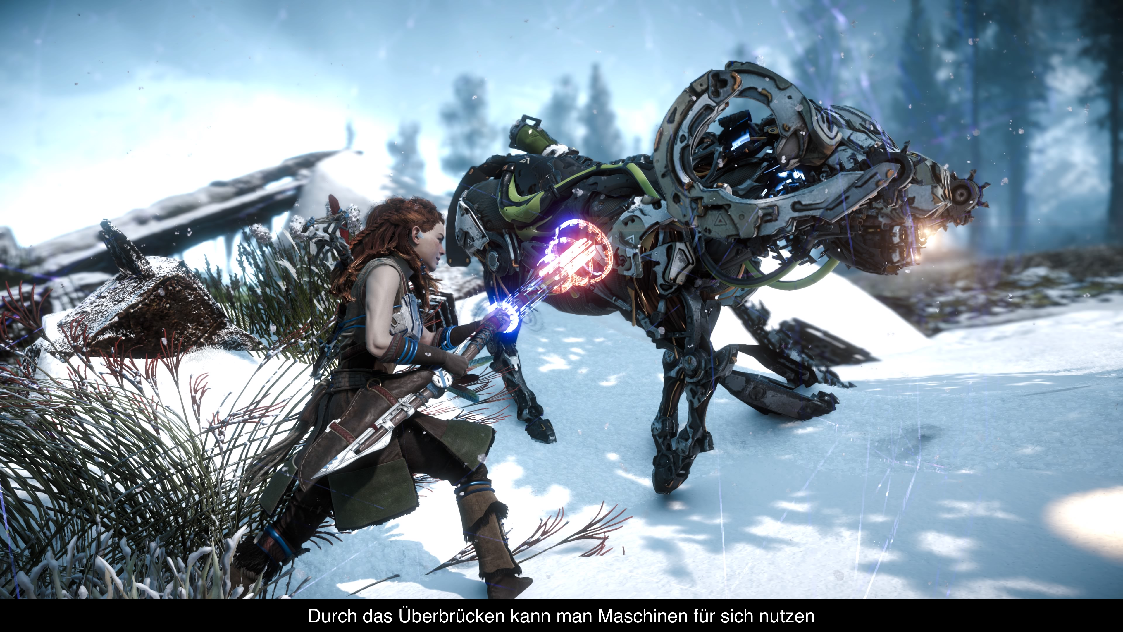 Wie bereits erwähnt, gibt es in der Welt von Horizon: Zero Dawn nicht nur gutmütige Menschen, sondern eben auch die Maschinen, wovon einige ziemlich feindselig sind. Trifft man auf solch eine Maschine ist ein Kampf manchmal unausweichlich, doch Vorbereitung ist hier die halbe Miete. Dazu stehen einem zahlreiche Waffen zur Verfügung, vom Bogen bis zum Stolperdraht, die allesamt noch unterschiedliche Elementarfunktionen bieten. So gibt es zum Beispiel Feuerpfeile oder Stolperdrähte, die entweder explodieren oder den Gegner kurzzeitig betäuben. Das hat auch alles seine Daseinsberechtigung, da die Maschinen unterschiedliche Schwachpunkte haben. Mal ist es ein Treibstofftank auf dem Rücken, den man zur Explosion bringen könnte oder eine gefährliche Waffe, die man schleunigst vom Gegner trennen sollte. Denn vor allem im späteren Spielverlauf geizen die Maschinen nicht gerade mit Feuerkraft. Mit dem richtigen Einsatz der Waffen kann man den Gegner aber stetig schwächen und ihm am Ende den Gnadenstoß versetzen, vielleicht sogar mit seiner eigenen Waffe. Wer sich also vorher über seinen Gegner schlau macht und seine Waffen und die Umgebung klug einsetzt, kann die Kämpfe kurz und einfach halten. Natürlich bekommt man nicht immer die Möglichkeit dazu und manchmal ist etwas mehr Initiative gefragt, aber auch hier macht sich Gegnerkunde bezahlt. Im Ernstfall kann man sich auch im Nahkampf zur Wehr setzen, aber hier sollte man auch etwas Hirn einsetzen. Denn wer einfach nur drauflos schlägt, wird schnell das zeitliche segnen. Die Kunst ist es hier im richtigen Moment die richtigen Schläge zu platzieren und öfters mal auszuweichen. Zeitweise erinnert das schon an die Dark Souls Spiele und macht dementsprechend auch viel Spaß. Einzig der Lock-On fehlt hier, was manchmal für etwas Chaos sorgt. Insgesamt bietet das Spiel unheimlich viele Taktik-Elemente und jeder Kampf gegen eine Maschine ist etwas besonderes und könnte in anderen Spielen ein Bosskampf sein. Die Möglichkeiten sind einfach riesig.