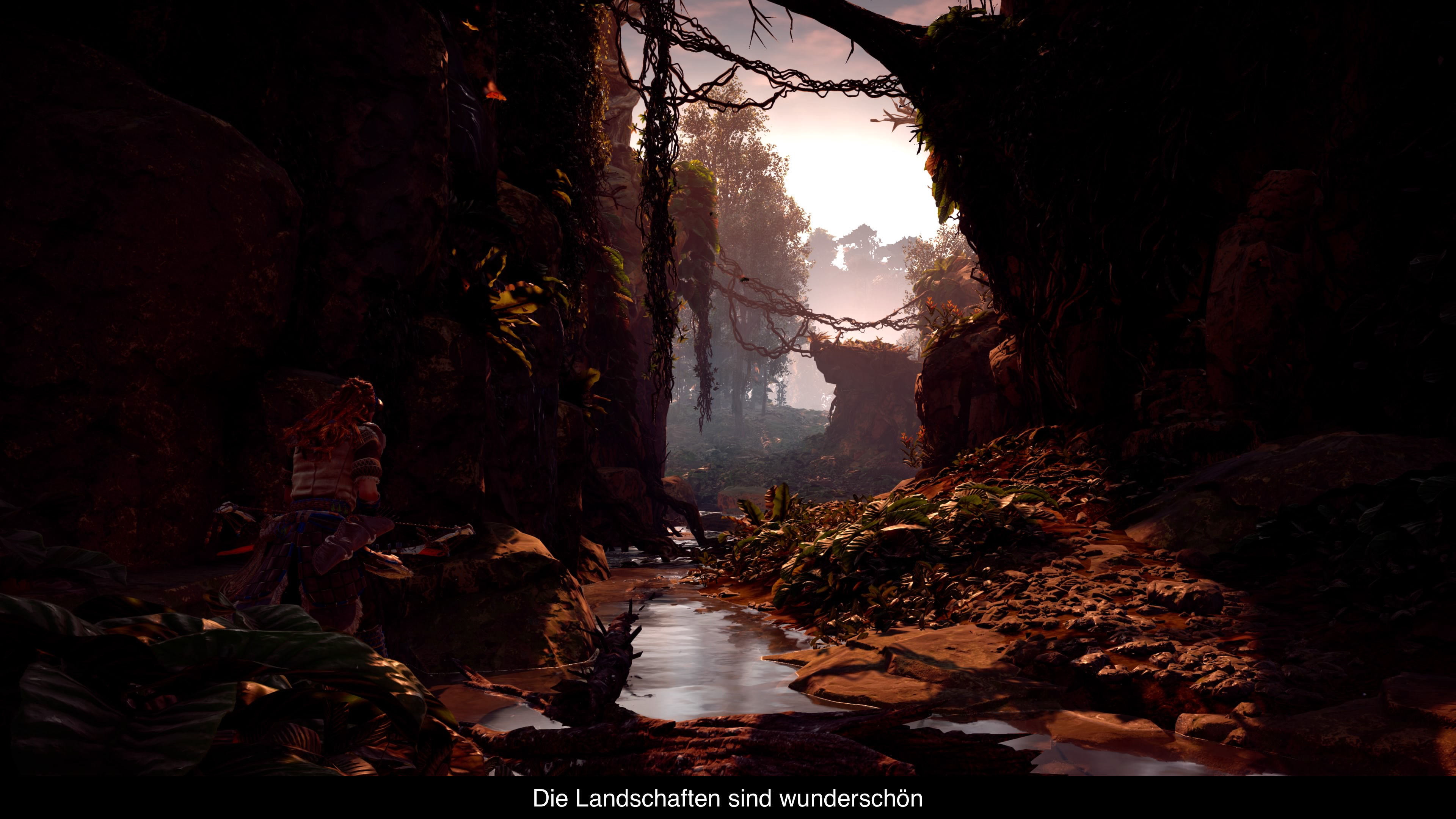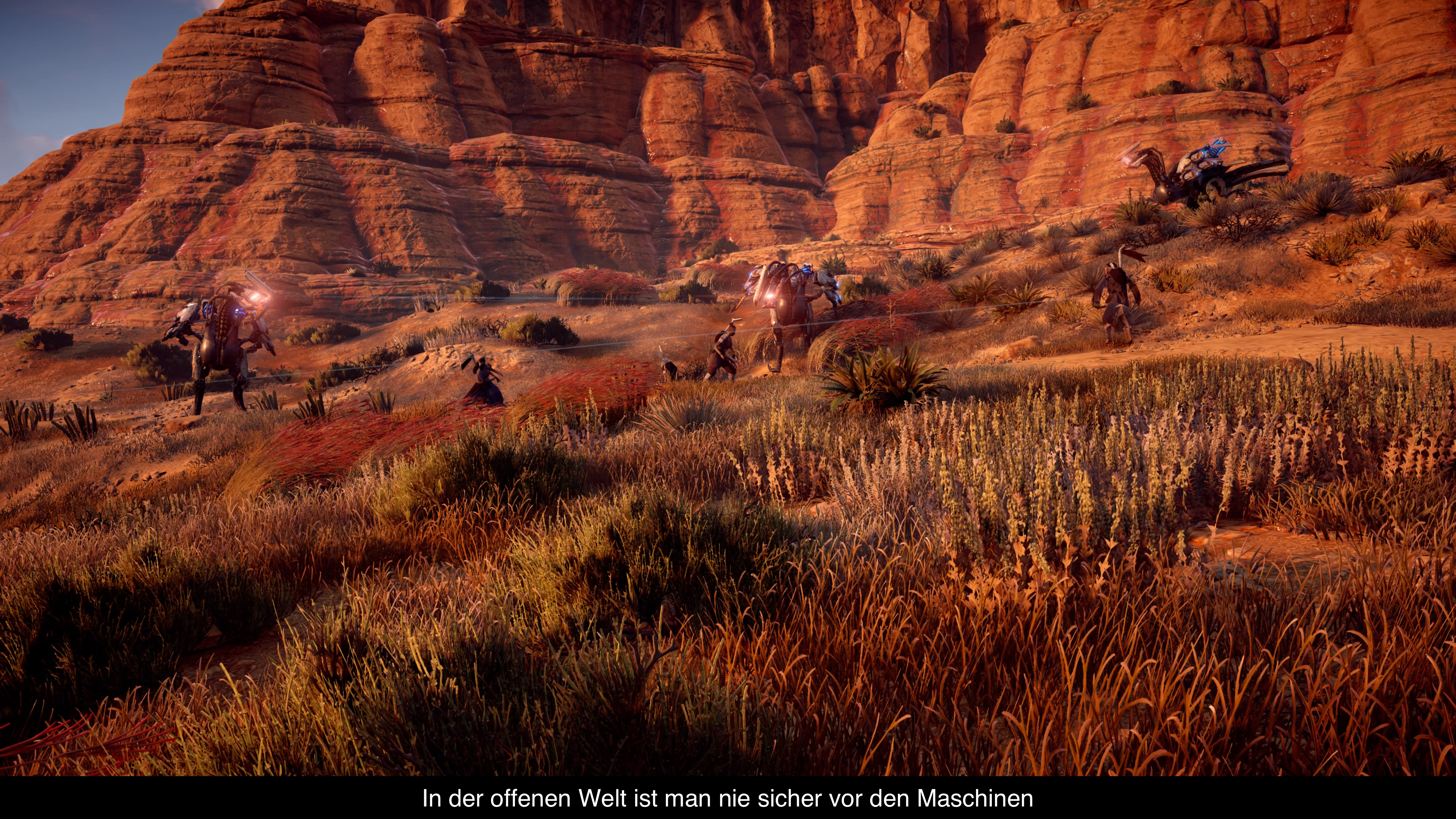 Technisch gehörte Guerilla Games schon immer zu den besten der besten, denn immerhin haben sie den Killzone 2 Teaser am Ende auf der PlayStation 3 zum Laufen bekommen und stellenweise sogar übertroffen und diese Expertise findet man auch in Horizon: Zero Dawn wieder. Das Spiel sieht einfach nur umwerfend aus und kann es problemlos mit Uncharted 4 aufnehmen, bietet dabei aber auch noch eine riesige offene Welt. Sowohl auf der normalen PlayStation 4 als auch der Pro läuft das Spiel mit meist stabilen 30 Bildern pro Sekunde und nur in einzelnen Fällen gibt es mal kleinere Ruckler, die aber nicht wirklich der Rede wert sind. Zudem gibt es tolles Anti-Aliasing, Motion-Blur und auf der Pro sogar eine 4k Ausgabe, die einfach umwerfend aussieht. Außerdem geizt das Spiel nicht gerade mit Effekten, wie Volumetric Lighting oder einigen Alpha-Effekten und hat auch schön hoch aufgelöste Texturen. Insbesondere Kleidungstexturen von z.B. Leder sind wahnsinnig gut geworden. Auch die Weitsicht ist umwerfend und man kann selbst in großer Entfernung noch große Gegner erkennen. Zudem ist die offene Welt wirklich abwechslungsreich gestaltet. Mal gibt es Waldgebiete, dann wieder eine Art Canyon und auch schneebedeckte Berge und all das mit einem dynamischen Tag-/Nachtwechsel und unterschiedlichen Wetterbedingungen. Eine kleine Schwäche gibt es aber noch, die Gesichtsanimationen. Diese wirken nämlich im Vergleich zum Rest etwas schwach und ausdruckslos, zudem fehlt meist die Lippensynchronisation, was etwas befremdlich wirkt.