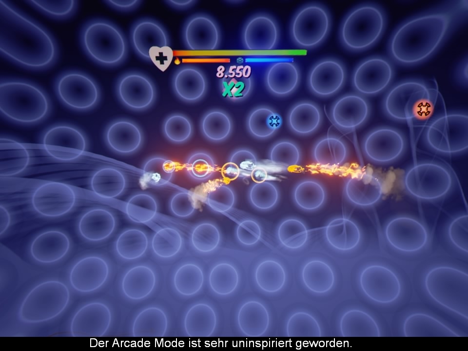 Das eigentliche Spielgeschehen ist sehr behäbig und gemütlich, da man sich nur langsam auf den vorgegeben Bahnen bewegt. Das Spiel soll einen also eher beruhigen als zu stressen und schafft dies auch, zumindest wenn man auf Easy oder Normal spielt, bzw. wem das immer noch zu hart ist im Zen Modus, wo einem Gegner nichts mehr anhaben können. So zieht man also gemächlich durch die vier grafisch sehr hübschen Levels ohne in Hektik zu verfallen. Leider ist dies alles auch etwas undynamisch und man hätte sich den ein oder anderen Kameraschwenk oder eine kleine Berg und Talfahrt inklusive Geschwindigkeitunterschieden gewünscht. Zudem hat man die vier Levels (Unterwasser, Wald, Lava, Schnee) in unter 30 Minuten durch, was natürlich extrem kurz ist. Eine kleine Geschichte wird übrigens nicht erzählt und man kann die Levels auch nicht am Stück spielen, sondern muss diese immer einzeln auswählen. Zudem erwartet euch nur EIN müder Endgegner in einem separat anwählbaren Abschnitt und ein karger Arcade Mode. Hier verweilt man dann starr in einem Raum voller Waben, aus denen die Gegner strömen und vernichtet werden müssen, bevor diese durch eine der Waben wieder entkommen. Grafisch wurden die vier Level jedoch sehr schön und abwechslungsreich umgesetzt, wobei das Geschehen stets flüssig bleibt. Hier und da gibt es in den Levels noch kleinere Ereignisse oder kleinere Animationen, welche durchaus auch zahlreicher hätten sein müssen. Leider gibt es auch nur ganze zwei (!!) Gegnertypen, was eindeutig zu wenig ist. Auch das fehlen von Endgegnern am Ende eines Levels schmerzt sehr. Immerhin passt der schöne Soundtrack zum gemächlichen Geschehen.