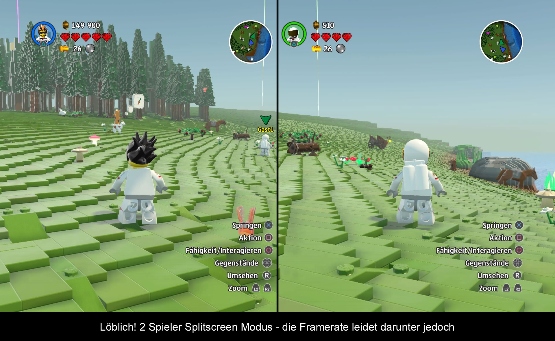 Technisch ist das Spiel sehr interessant. Erstmalig haben die Entwickler ganze LEGO Welten aus LEGO Steinen kreiert. Jedes Set kann in der realen Welt nachgebaut werden. Dadurch ist es möglich, dass man die Welt nach Belieben verändern kann. Ähnlich wie bei No Man’s Sky setzt man auch auf prozedurale Generierung. Alle Themenwelten folgen einem bestimmten Muster und einer bestimmten Logik. Das soll für unendliche Abwechslung sorgen, doch fehlerfrei ist das System leider nicht. Im Laufe der Reiste trifft man immer wieder auf dieselben Landschaften und Objekte. Auch die Mission ändern sich nicht gravierend. Das hier und da ein Charakter ober Objekte seltsam platziert sind, darüber kann man hinwegsehen, über die technischen Schwierigkeiten aber nicht. Die Sichtweite im Spiel ist zum Beispiel stark eingeschränkt und es braucht einige Zeit, die Welt vor einem zu Generieren. Ist man mit einem Fahrzeug unterwegs, steht man öfters vor einem leeren Feld und die Landschaft baut sich langsam vor einem auf. Auch der Wechsel zwischen einer Welt zur Nächsten dauert eine Ewigkeit, besonders wenn man diese schon selbst ummodeliert hat. Neben der technischen Limitierung kommen noch Framerateprobleme dazu. Bei jedem größeren Nachladen ruckelt das Spiel und braucht seine Zeit, um wieder in Schwung zu kommen. Schaltet man hier noch auf den lokalen Zweispielermodus um, scheint die Engine an ihr Limit zu kommen. In Anbetracht des Umfangs, kann man das noch Verschmerzen, doch die vielen Bugs dafür nicht! Es scheint, als hätte man das Qualitätsmanagment komplett außen vorgelassen. KI Aussetzer und die Wegfindung sind kleiner Probleme, aber was macht man, wenn die Spielfigur einfriert? Es kann vorkommen, dass sich diese nicht mehr steuern lässt, die Objekte nicht wechseln oder man einfach in der Ego-Perspektive festhängt. Viele der Bugs lassen sich nur mit einem Neustart beheben, bei manchen reicht es auch aus, einfach neu in die Welt abzuspringen. Der gefährlichste Bug bleibt aber der korrupte Spielstand. Ohne Vorwarnung kann das Savegame gelöscht werden und man darf wieder von vorne begonnen werden!