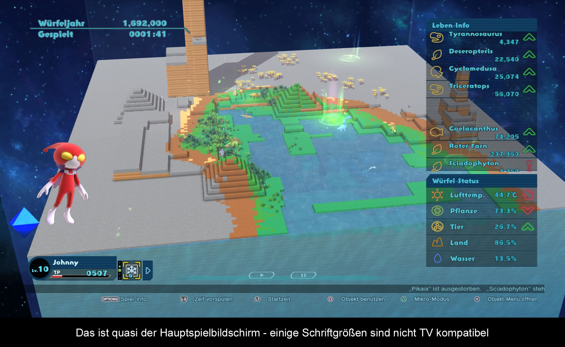 Verpackt ist diese komplexe Spielmechanik in ein schnuckeliges Design. Der visuelle Stil passt erstaunlich gut zu dieser Art von Spiel und ermöglicht, schnelles und einfaches Zuordnen von Lebensformen und Pflanzen. Technisch gesehen, spielt „Birthdays the Beginning“ natürlich nicht in der obersten Liga, aber dank des guten Designs ist dies auch nicht so wichtig. Immerhin bleibt das Spiel immer ruckelfrei, auch bei größerem Treiben in dem Würfel. Nur mehr Animationen für die Tiere hätten es schon sein können. Diese spulen immer wieder die gleichen Animationen ab und wirken mit der Zeit leicht langweilig. Auch akustisch plätschert das Spiel etwas lieblos dahin. Kein musikalisches Thema bleibt einfach hängen. Zudem hätten die Menüs hätten auch noch etwas Feinschliff vertragen können. Das User Interface ist zwar sehr informativ, doch nicht gerade übersichtlich und die Schriftgröße viel zu klein. Sich im Baum des Lebens zu Recht zu finden, ist somit etwas kompliziert geraten.