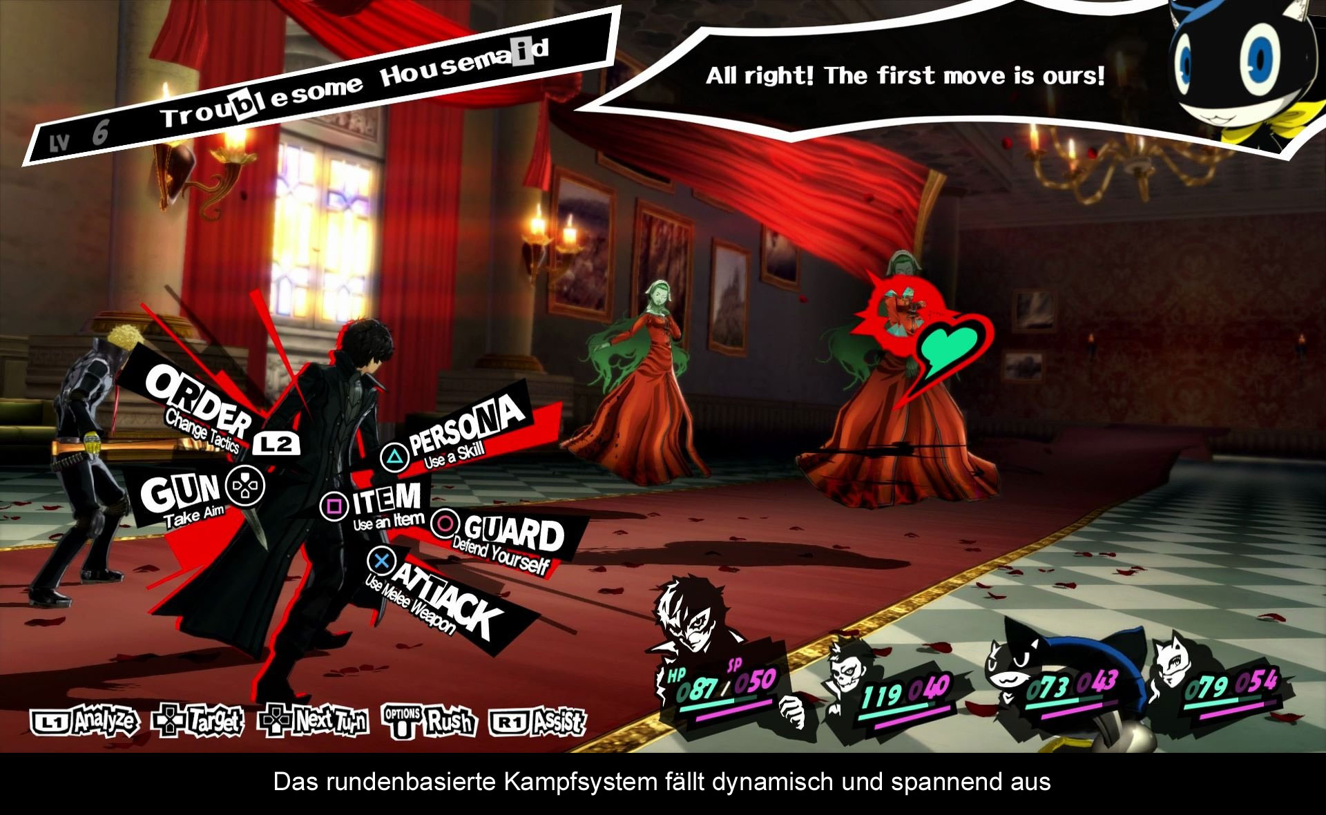 Entscheidet ihr euch für letzteres, bekommt man gefühlt seit einer Ewigkeit mal wieder ein rundenbasiertes Kampfsystem vorgesetzt, was im Falle von Persona 5 sehr gut umgesetzt wurde. Wie in anderen rundenbasierten Kampfsystemen kämpft ihr mit einem Team aus vier Charakteren und wählt für jeden Charakter seine Aktionen in aller Ruhe aus. Wollt ihr Angreifen, wollt ihr euch Verteidigen oder vielleicht doch lieber die mächtige Magie der Personas nutzen? Bis hier ist es ein relativ altbekanntes Kampfsystem, jedoch haben die Entwickler durch kleine Sonderfeatures ein extrem dynamisches Kampfsystem geschaffen. Denn die meisten Gegner haben bestimmte Schwächen und Stärken und wer die Schwächen entsprechend ausnutzt, kann seinen Gegner zum Kniefall bewegen und ihn dann mit seinem Team umzingeln. Euer Gegenüber möchte aber natürlich überleben und so könnt ihr ihm Geld oder ein Item abverlangen oder ihm anbieten sich euch anzuschließen. Dazu gibt es ein kurzes Gespräch mit dem verrückten Monster und wenn ihr ihn überzeugen konntet, schließt er sich euch an und ihr könnt seine Kräfte im Kampf nutzen. Im späteren Spielverlauf gibt es noch mehr Möglichkeiten diesen Sachverhalt einfacher herbeizuführen, aber insgesamt gesehen können Kämpfe so auch schon mal nach einem Angriff enden, wenn man die Schwächen der Gegner kennt. Dies lässt die Kämpfe nicht zu lang werden und dank etwas unvorhergesehener und wirklich verrückten Gesprächsverläufe wird es selten langweilig in den Kämpfen.