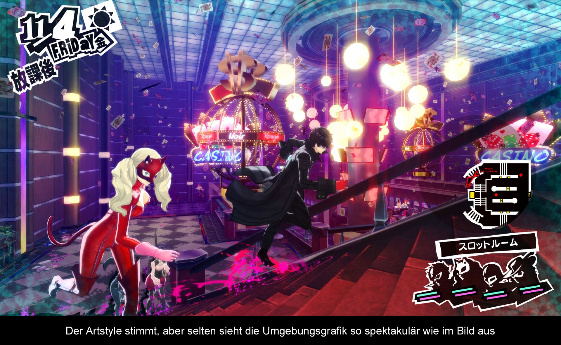 Denn das Spiel ist auch in mehrere Kapitel eingeteilt, an dessen Ende es darum geht einen Sinneswandel bei einer bestimmten Zielperson einzuleiten. Schafft man dies bis zur Deadline nicht, sieht man den Game Over Bildschirm. Die Deadlines sind aber recht großzügig gesetzt, sodass dies nie ein echtes Problem sein sollte. Um aber den Sinneswandel auszulösen, muss man im Metaverse den Schatz aus dem Palast der Zielperson stehlen. Hier kommt dann der Dungeon Crawler Teil, in dem man sich durch ein vorgefertigtes Labyrinth kämpft, kleinere Puzzle löst und natürlich auch alle Ecken absucht, um ja nichts zu verpassen. Das Leveldesign der Dungeons ist relativ simpel gehalten, wird zum Ende hin aber etwas komplexer. Natürlich setzen sich die Zielpersonen zur Wehr und so patrouillieren unzählige Gegner in den Dungeons und ihr habt die Wahl euch an ihnen vorbeizuschleichen oder den Kampf zu suchen.