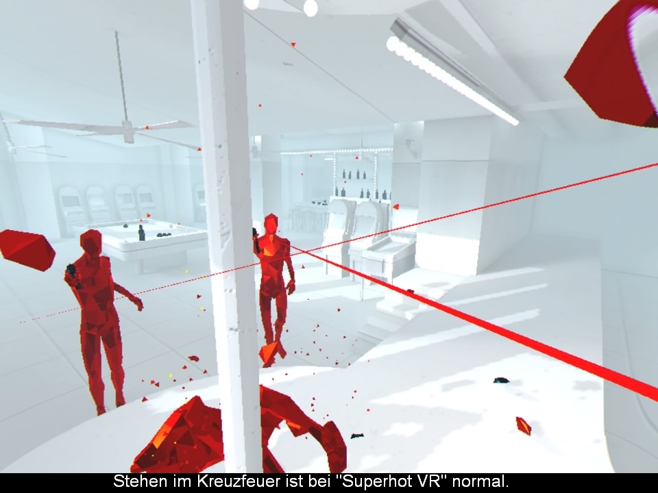 Ursprünglich handelt es sich bei “Superhot” um ein Flash Game, welches 2013 bei einer sieben Tage Challenge programmiert wurde. Der Kniff bei dem Spiel lag darin, dass sich die Gegner nur bewegten, wenn man sich selbst bewegt hat. Dieses grundlegende Spielkonzept hat man in der nun veröffentlichten VR Version zwar beibehalten, doch das restliche Spiel komplett umgekrempelt. Die Bewegungen der Gegner passen sich dabei genau der eigenen Geschwindigkeit an und stoppen, wenn man selbst regungslos bleibt. Somit hat man die volle Kontrolle über die Spielgeschwindigkeit und kann seine nächsten Aktionen genau planen, was dem Titel eine ziemliche Tiefe verleiht und man sich gewisse Strategien zurechtlegen muss. Ganz nebenbei schaut das Ganze dadurch extrem stylisch aus und man fühlt sich wie Neo aus dem Film “Matrix”.