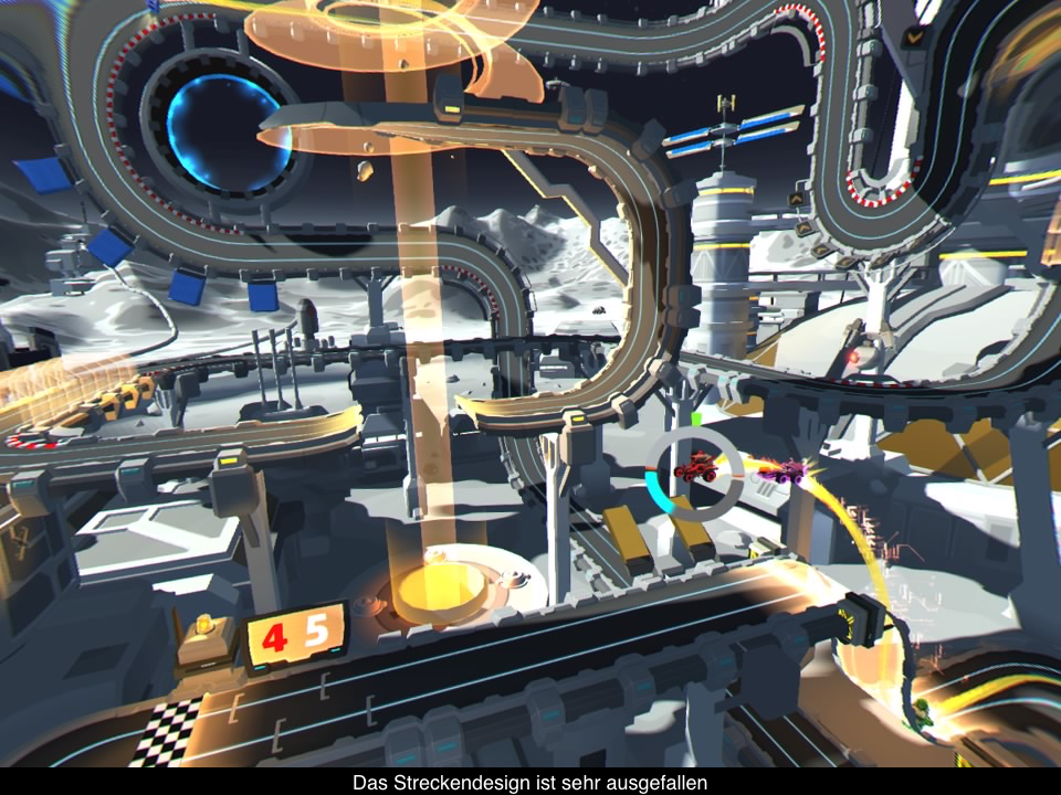 Das Gameplay von Tiny Trax ist relativ simpel zu beschreiben. Es hat sich offensichtlich von den Carrera-Bahnen inspirieren lassen, denn auf den Kursen gibt es jeweils zwei Bahnen zwischen denen man frei hin- und herwechseln kann. Dies alleine wäre aber langweilig, weswegen man es in Tiny Trax um ein paar Kniffe erweitert hat. Einerseits gibt es einen Boost und andererseits muss man in den Kurven mitlenken. Hierbei ist aber Fingerspitzengefühl gefragt, denn wenn ihr zu wenig oder zu viel lenkt, werdet ihr teilweise bis zum Stillstand abgebremst. Gleichzeitig füllt ihr mit einem guten Lenkwinkel auch eure Boost-Anzeige auf. Was leicht klingt, ist im ersten Moment ziemlich schwierig, denn das Boosten, Lenken und Bahnwechseln will gut koordiniert sein. Vor allem verzeiht euch das Spiel keine Fehler, wenn ihr eine Chance auf den Sieg haben wollt. Eine Lernkurve gibt es quasi nicht, ihr müsst die Zähne zusammenbeißen und dranbleiben bis ihr erste Erfolge feiert. Das kann schon mal eine Stunde dauern.