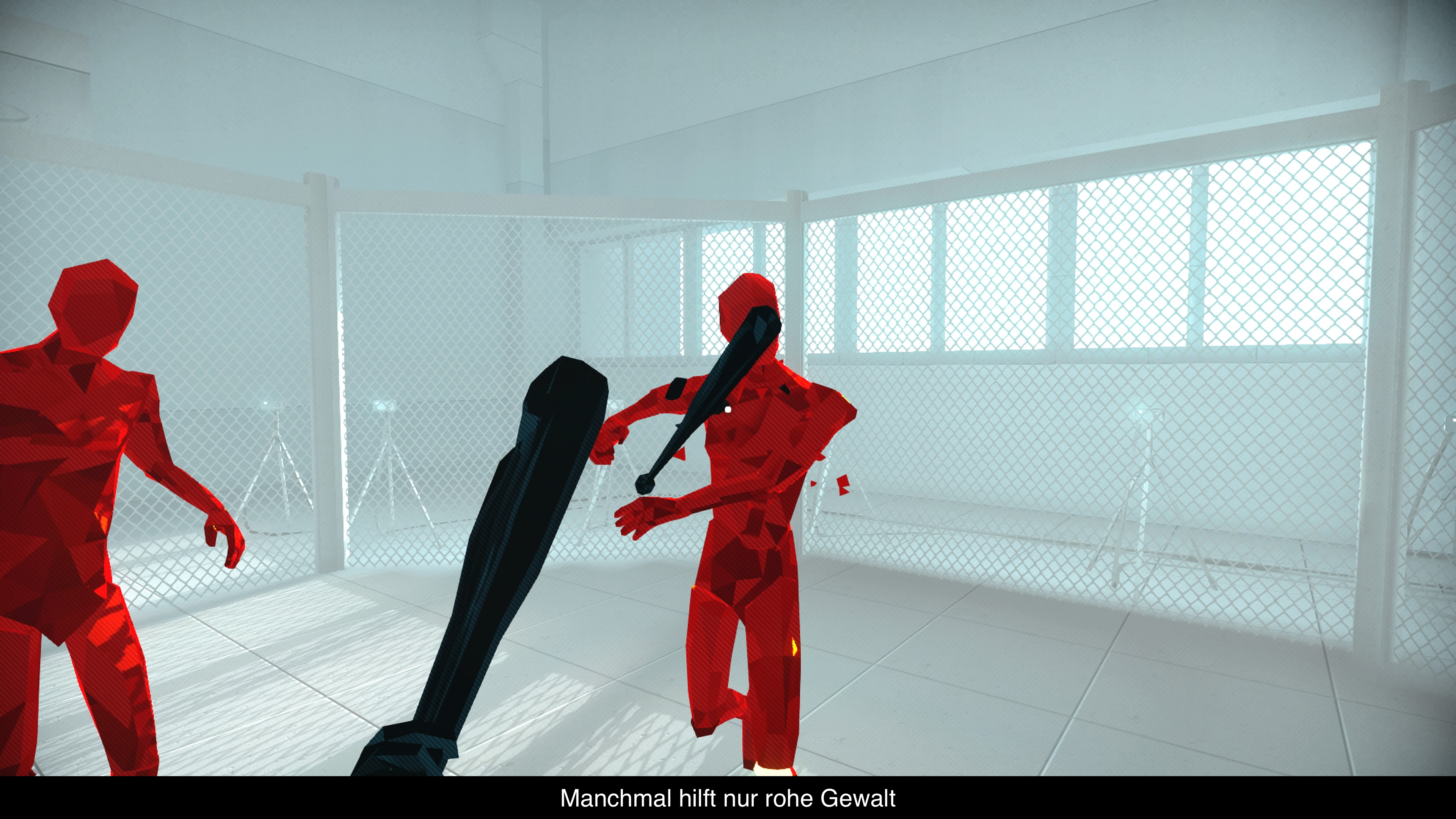 Auf den ersten Blick scheint Superhot ein recht normaler First-Person Shooter zu sein. Die Mechaniken dürften jedem bekannt sein, aber es gibt einen ganz besonderen Twist. Wenn man sich nicht bewegt, steht die Welt still. Sobald man sich aber bewegt, bewegt sich auch alles Weitere in der Welt. Das ist im ersten Moment sehr gewöhnungsbedürftig, weil die bereits eingebrannten FPS-Mechanismen in Superhot nicht greifen. Sehr schnell gewöhnt man sich aber daran und dann geht's rund. Denn das Spiel ist in mehrere relativ kurze Level eingeteilt in denen die Gegner euch umlegen wollen und ihr müsst natürlich überleben. Hierbei steht euch eine große Auswahl an Nah- und Fernwaffen zur Verfügung. Selbst mit euren Fäusten könnt ihr euch im Ernstfall zur Wehr setzen. Manchmal ist dies auch notwendig, denn durch einen gezielten Schlag könnt ihr dem Gegner die Waffe abnehmen und sie gegen ihn einsetzen. Regelmäßig muss man dabei die Waffen wechseln, da sie ein begrenztes Magazin haben und so kämpft man sich schon fast wie Neo aus Matrix durch die Level. Manchmal benötigt man etwas Trial & Error um sich die Gegnerformationen zu merken, aber wirklich frustrierend wird es dabei nie.
