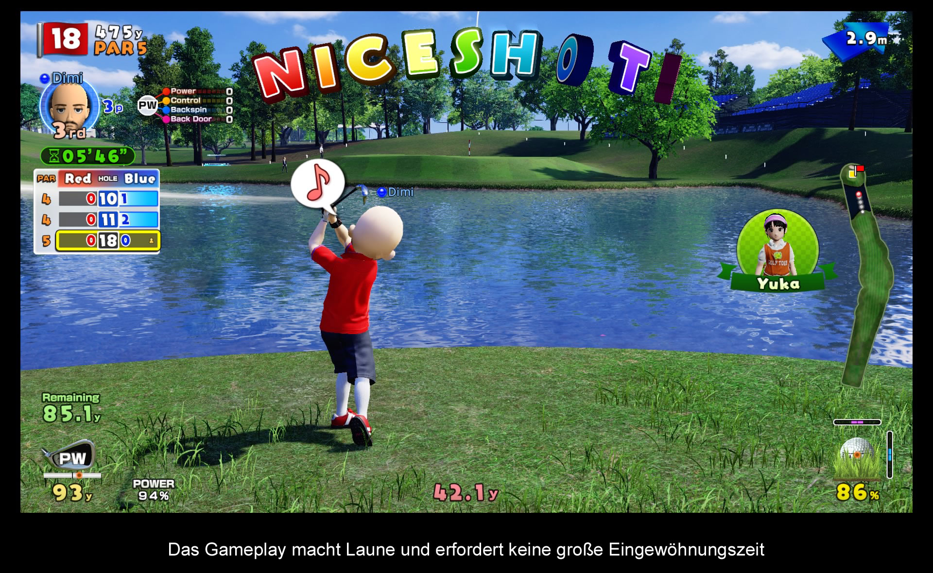 Es gibt mehrere Anreize, warum es sich lohnt, sich ausgiebig mit dem Singleplayer zu beschäftigen. Da wäre zum Beispiel das Freischalten von neuen Klamotten oder das Gewinnen vom Preisgeldern, die ihr beide jeweils durch das Absolvieren von Turnieren erlangt. Aber über allem steht nach wie vor das Gameplay, welches leicht zu erlernen, aber sehr schwer zu meistern ist. Glücklicherweise hat sich bei der Spielart jedoch nicht viel verändert, wodurch alteingesessene Fans sich schnell zurechtfinden werden. Everybody's Golf umfasst immer noch das altbekannte 3-Klick-System beim Abschlagen. Ein Klick zum Aktivieren der Power-Anzeige; gefolgt von einem weiteren Klick, um beim Power-Balken die Kraft eures Abschlages festzulegen, und einem abschließenden Klick, um die Präzision festzulegen. Es bedarf ein präzises Reaktionsvermögen, um gute Schläge hinzukriegen, aber normalerweise dauert es nicht lange bis man das nötige Feingefühl bekommt. Abgerundet wird das Abschlagen durch zusätzliche Skills, wie zum Beispiel verschiedene Spins, die euren Golfball nach der Landung nochmals in eine bestimmte Richtung bewegen können. Dabei handelt es sich um typische Pro-Moves, die man so schnell wie möglich lernen sollte, um langfristig Siege einfahren zu können. Wie gut man auf dem Kurs ist, hängt auch von euren Fähigkeiten ab, die im Laufe des Spiels im Stile eines RPGs an Erfahrung gewinnen und immer besser werden. Was die KI-Charaktere angeht, sind eure Gegenspieler anfangs noch recht einfach zu besiegen, wobei es jedoch nicht lange dauert bis man auf härtere Kontrahenten stoßt, die mehr Einsatz von euch verlangen. Während das Gameplay im Großen und Ganzen unverändert geblieben ist, gibt es vor allem in der Präsentation zahlreiche Neuerungen, die man so zum aller ersten Mal sieht.
