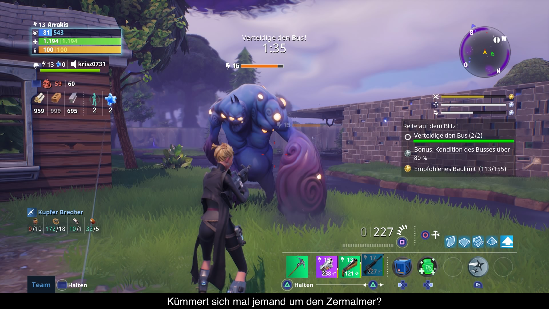 Fortnite wird zwar nie ganz den F2P Charakter los, aber was Gameplay und Steuerung betrifft, lässt es die Konkurrenz weit hinter sich. Man merkt einfach das Epic Games die Spezialisten für Shooter sind. Die Steuerung der Figuren geht leicht von der Hand. Jede Klasse hat seine Eigenheiten und intuitiv setzt man diese im Kampf ein. Alle Tasten sind perfekt belegt und erfordern keine große Umstellung. Selbst das Bau-Menü wurde so angelegt, dass man intuitiv bauen kann. Wände sind auf ein 3x3 Feld ausgelegt, Böden und Dächer ein 2x2. Man platziert diese Objekte einfach auf dem Raster und kann sie leicht ändern, um eine Tür, Fenster oder halb hohe Mauer zu schaffen. Dazu gibt es noch ein paar Sonderlösungen welche man im Laufe der Missionen lernt. Auch das Inventar wurde so gestaltet, dass man schnell notwendige Waffen und Fallen erzeugen kann. Das Spiel listet die notwenigen Ressourcen auf und auf Knopfdruck wird es hergestellt. All dies läuft sogar bei den hitzigsten Gefechten bestens, ohne dass man an Spielgeschwindigkeit verliert. Was Waffen betrifft, erfordern diese auch keine große Einarbeitungszeit. Auf den ersten Blick erkennt man mit welcher Art man es zu tun hat und wie sich diese verhalten wird. Egal ob mächtiger Revolver oder Energie Gewehr, drückt man den Abzug, hat man ein zufriedenes Gefühl, wenn die Hüllen vor einem fallen. Nur die Nahkampf Waffe ist etwas eigen. Diese hat zwei Angriffe, welche wenig Wirkung zeigen. Sie ist vor allem für Notfälle gedacht, wenn keine Munition hergestellt werden kann.