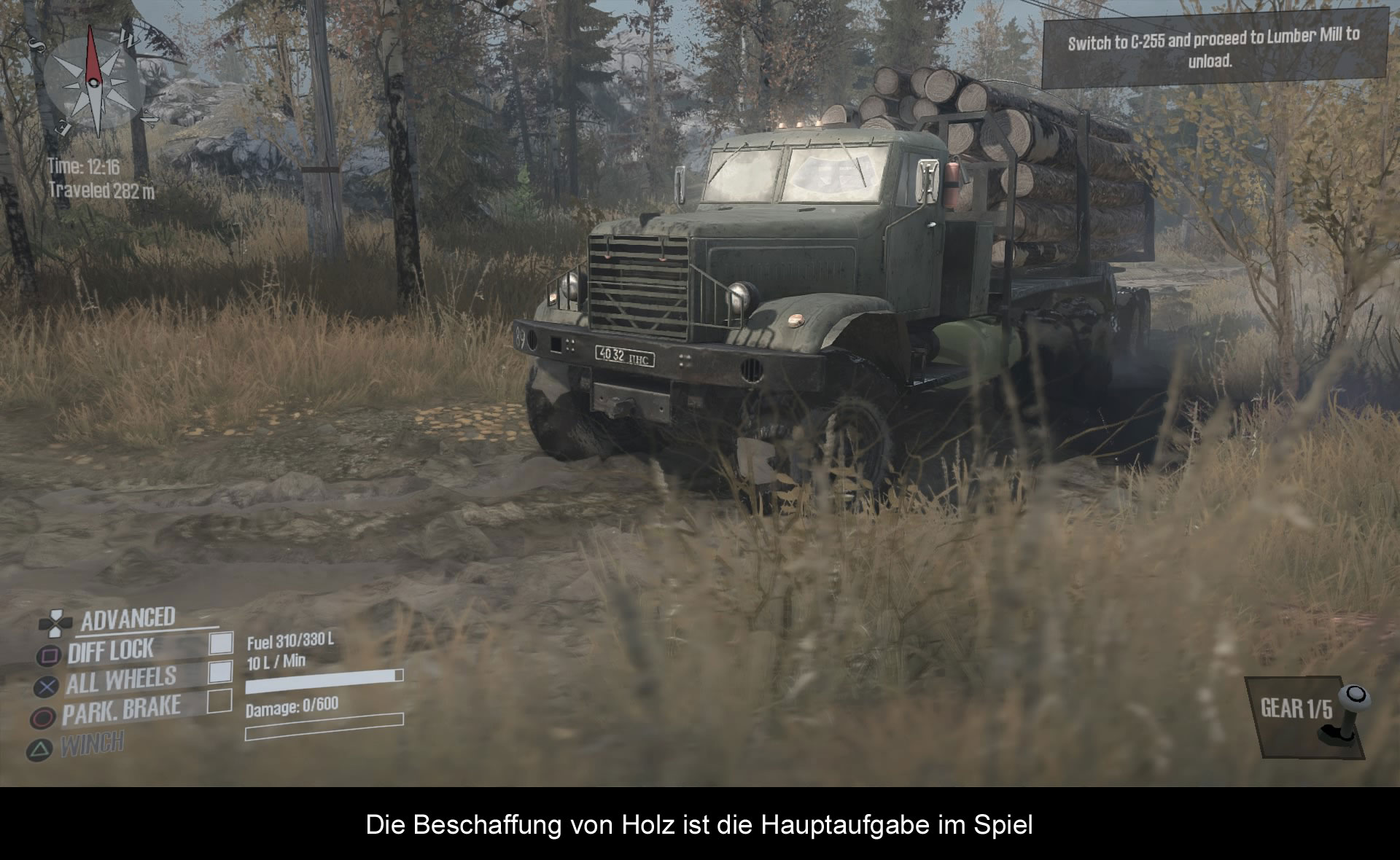Im Zuge der Level gibt es verschiedene Fahrzeuge zu entdecken, die einmal entdeckt, dann auch später im euren Repertoire stehen. Weitere Fahrzeuge, wie Tanklaster, sind zum Beispiel von Nöten, um euren Truck auch langfristig im Gang zu halten. Gleiches gilt auch für schwere Fahrzeuge, die euch in Zeiten der Not aus Sümpfen oder tiefen Gewässern ziehen können. Sofern man jedoch nicht all zu tief im Schlamassel festsitzt, kann man auch selbst Enterhacken an Bäumen befestigen, um sich somit aus brenzligen Situationen zu retten. Die Umgebungen der einzelnen Maps bieten dabei verschiedene Herausforderungen, wie reißende Flüsse, hohe Gebirge, enge Wälder… und Matsch – jede Menge Matsch. Und wie schon der Name des Spiels verrät, spielt Matsch eine enorme Rolle in diesem Titel. So haben sich die Entwickler nicht lumpen lassen und ihre Simulations-Muskeln voll und ganz ausgespielt, was man zum Beispiel an der dynamischen Umgebung sehen kann, die sich im Laufe eurer Fahrten immer mehr verändert. Während die Hinfahrt beispielsweise noch relativ harmlos sein kann, können durcheinander gebrachte Matschgruben eure Rückfahrt durch die Landschaften deutlich schwieriger gestalten. Doch da die Welt bzw. die Karten von Mudrunner frei befahrbar sein, kann man stets nach neuen Wegen Ausschau halten, um an sein Ziel zu gelangen. Mir persönlich hat die Schlichtheit des Gameplay und die simplen Missionsziele zwar gefallen, aber ich kann mir jedoch vorstellen, dass nicht jeder unbedingt ein Fan davon sein wird, da die Holzbeschafffung auf Dauer vielleicht etwas zu eintönig ist. Aber gerade hier empfiehlt es sich die weiteren Gebiete freizuschalten, da neue Umgebungen immer wieder einen frischen Wind das Geschehen bringen.