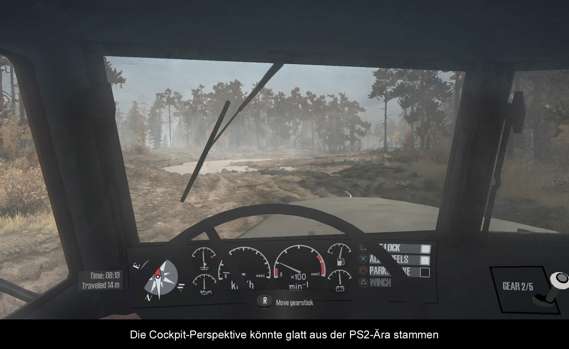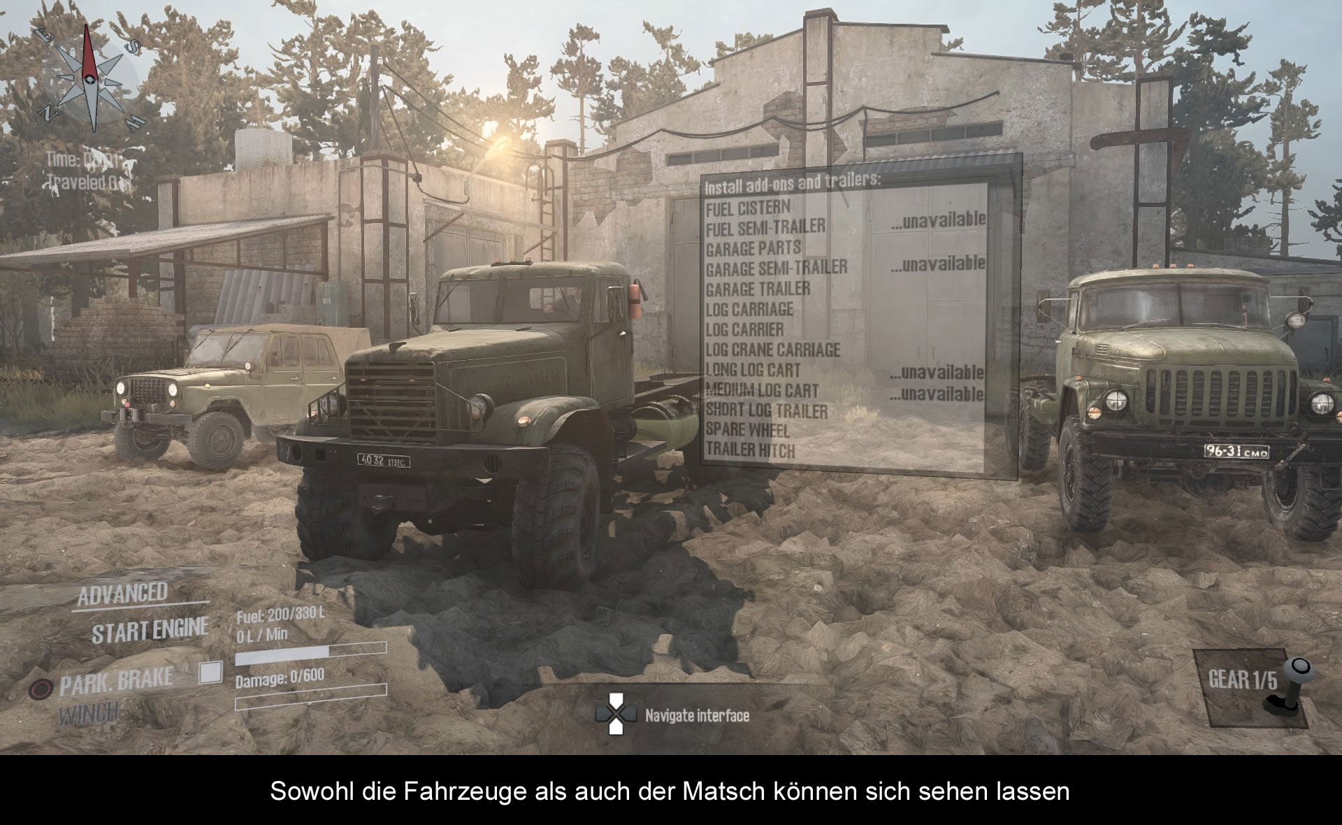 Simulator-Spiele sind oftmals nicht für ihre hohe grafische Qualität bekannt, doch Mudrunner kann sich in dieser Hinsicht ganz gut von anderen Simulations-Spielen abheben. Die Landschaften, die wohl irgendwo in der russischen Pampa gelegen sind, überzeugen zwar nicht unbedingt durch große Farbenvielfalt, aber das braun-graue Farbbild und die üppige Vegetation passen dennoch optimal zum Geschehen. Hinzu kommen gut modellierte Fahrzeuge sowie hervorragend animierter Matsch. Nicht ganz so gelungen sind jedoch die Fahrerkabinen ausgefallen, die gerade mal PS2-Niveau haben und definitiv nicht mit der gleichen Qualität entwickelt wurden, wie andere Teile des Spiels. Aber auch vereinzelte Clipping-Fehler sowie matschige Texturen sorgen dafür, dass die grafische Qualität nicht vollends überzeugen kann. Und auch die Menüführung ist oft sehr wirr und nur schwer zu bedienen. Was den Sound angeht, überzeugt Mudrunner durch schwere und authentische Motorenklänge. Wenig überzeugend ist jedoch der Soundtrack, der einige fragwürdige Rocksongs aufweist, die nicht wirklich zur Atmosphäre beitragen und angesichts der trüben und tristen Umgebung etwas fehl am Platz wirken. Ich persönlich hätte mir zur Abhilfe am Liebsten ein Online-Radioprogramm gewünscht, wie man es zum Beispiel von Euro Truck Simulator kennt.