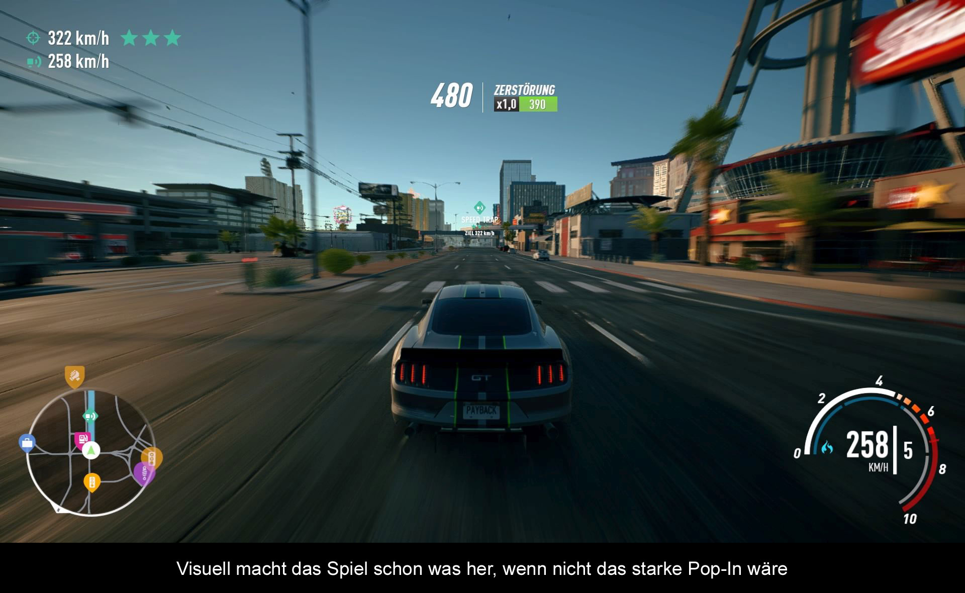 Grafisch war der Vorgänger – zumindest in Teilen – ein echter Hingucker. Unter bestimmten Lichtbedingungen sah das Spiel sogar fast fotorealistisch aus. „Payback“ ist davon ein ganzes Stück entfernt, macht aber dennoch einen soliden Eindruck. Erst einmal weil die offene Spielwelt auch abseits der Straßen befahrbar ist und dann gibt es noch einen wirklich hübschen dynamischen Tag- und Nachtwechsel. Die malerischen Wüsten- bzw. Bergregionen, die klar von Las Vegas und Umgebung inspiriert sind, wirken ebenfalls glaubhaft. Das Geschwindigkeitsgefühl könnte dafür besser sein und die Bildqualität lässt ebenfalls ein wenig zu wünschen übrig. Zumindest auf der normalen PS4, auf der PS4 Pro gibt es eine marginal bessere Auflösung und weniger störende Pixelkanten. Die Framerate bleibt im Großen und Ganzen stabil bei 30 Bildern pro Sekunde. Lediglich wenn man als Staatsfeind Nummer 1 gejagt wird, gibt es schon mal heftige Ruckler und die Steuerung steigt teilweise aus. Am Auffälligsten ist jedoch das heftige Pop-In von unzähligen Details – vor allem auf der normalen PS4. Sogar in den kurzen Zwischensequenzen kommt die Engine nicht mit dem Streamen hinterher und lässt die Feinheiten erst spät ins Bild ploppen. Mit dem letzten Update wurde zwar auch hier nachgebessert, aber von einem Paradebeispiel technologischer Überlegenheit kann man nicht sprechen.