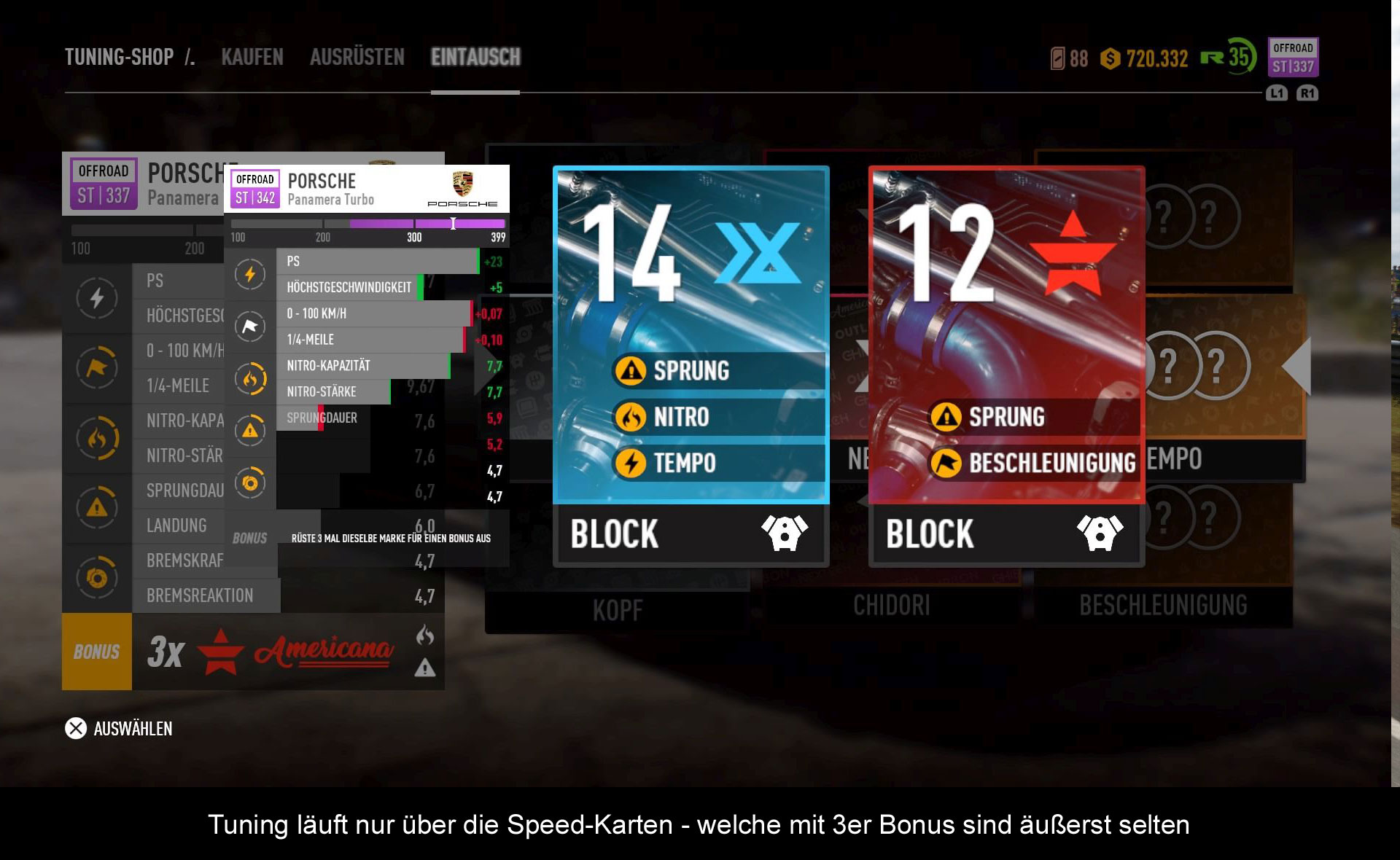 Wir haben nun also ein eher mittelprächtiges Rennspiel und doch kann es Publisher EA nicht lassen, nochmal nachzutreten. Wie? Mit einem Lootbox System, das tief im Gameplay verwurzelt ist und quasi nur darauf ausgelegt ist, den Spieler solange zu vergrämen, bis er mit richtigem Geld sich Cheats – ich meine natürlich – spielrelevante Vorteile (Ingame Geld, verbrauchbare Sachen wie Reifenqualm, Teile-Token und Speed-Karten) erkauft. Natürlich muss man kein echtes Geld in Lootboxen investieren, nur zieht sich dann das Gameplay hin wie Kaugummi und malträtiert den Spieler mit unendlichen Wiederholungen von Events. Denn für jedes gewonnene Rennen (zweite Plätze zählen nicht) bekommt ihr die Chance, eine Speed-Karte zu ziehen. Diese werten euer Auto in verschiedenen Kategorien auf und vergeben Boni auf Bremsen, Nitro usw. Solltet ihr eine schlechtere Karte ziehen (was durchaus passieren kann), dann könnt ihr diese Karte noch immer gegen ein Teile-Token eintauschen. Mit drei (!) Token dürft ihr dann an einem Glücksspielautomaten neue Speed-Karten gewinnen, die definitiv besser sind, als die, die ihr in den Rennen gewinnen, oder in den Shops mit Ingame Währung kaufen könnt. Die verschiedenen Events haben übrigens bestimmte Stufenanforderungen, die – bevor EA temporär mit einem Patch einlenkte – oftmals weitaus über dem Spielerauto lagen und man deshalb von vornherein bei Rennen kaum eine Chance hatte. Nur die Drift-Events sind allesamt sowas von einfach, dass man dort kein mega-getuntes Auto braucht. Nach dem letzten Update auf Version 1.04 bekommt man nun öfters und vor allem mehr Belohnungen, weswegen es nun einfacher ist, sich neue Autos zu kaufen bzw. Speed-Karten zu erwerben. Allerdings dürfte diese Maßnahme nur vorrübergehend sein, da EA zurzeit für eine ähnliche Anti-Spieler Politik in „Star Wars: Battlefront II“ öffentlich unter Beschuss steht. Stellt euch das einfach wie ein Doppel-XP Wochenende vor. Ein grundlegendes Problem beheben diese „Verbesserungen“ auch nicht. Für jedes Auto müsst ihr neue Speed-Karten erspielen bzw. kaufen. Ähnliche wie in „The Crew“ wird dadurch der Fuhrpark überschaubar gehalten, es sei denn, man grindet sich zu Tode. Das hat mit Spielspaß – S P A ß – genauso buchstabiert man das nämlich, nicht viel zu tun. Ironischer weise gibt es jetzt unendlich Stellplätze für die Wagen, sofern man alle Garagen gekauft hat.