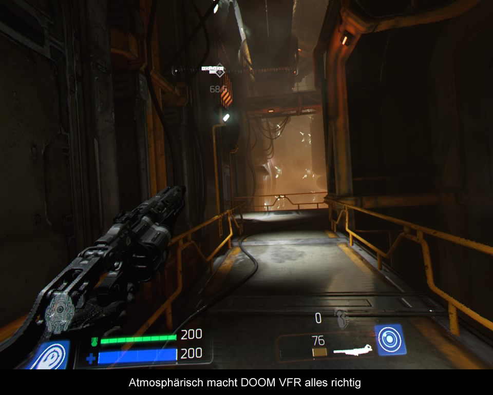 Da „DOOM VFR“ komplett neu für die virtuelle Realität konzipiert wurde (mit Hilfe von bekannten Bruchstücken aus „DOOM“), konnte sich id Software voll und ganz den technischen Möglichkeiten anpassen und das Spiel so programmieren, dass es die Schwächen von VR gekonnt kaschiert. Um Rechenleistung zu sparen, wurden die Levels alle ziemlich eng, schlauchförmig und kurz designt. Größere Räume sind zwar vorhanden, doch kommen diese dennoch recht übersichtlich daher. Auf der anderen Seite kann dadurch die Texturqualität auf einem für VR Verhältnisse hohem Level gehalten werden und lässt einem die Kinnlade runterklappen. So etwas hätte man auf der gegenüber PCs doch eher schwachen PlayStation 4 Pro nicht für möglich gehalten! Hinzu kommen eine fabelhafte Beleuchtung und viele cool Details wie Nebelschwaden, Funkenflüge oder große Ventilatoren, welche das Licht zerschneiden. All das sorgt für eine grandiose Atmosphäre! Technisch ist „DOOM VFR“ damit DAS Vorzeigespiel schlechthin, wenn man Skeptikern mal zeigen will, was die PSVR zu leisten vermag. Aber auch das Sounddesign ist hervorragend, überzeugt mit harten Riffs während der Action und angsterfüllenden Schreien, wo einem das Herz in die Hose rutscht.