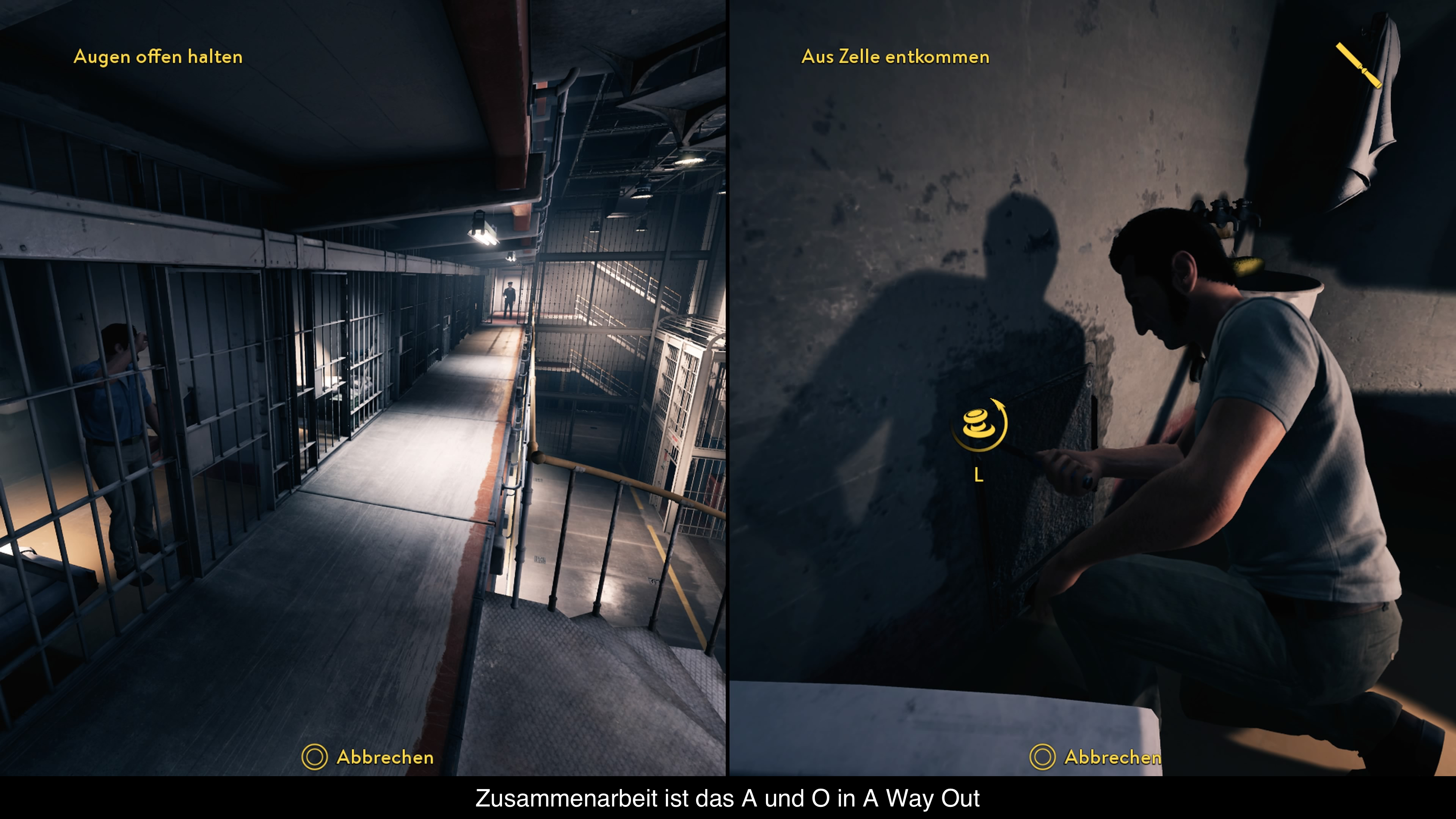 Wie bereits erwähnt, handelt es sich bei A Way Out um ein Koop-Spiel. Dabei kann man das Spiel entweder lokal oder online mit einem Freund spielen und immer wird das Spiel im Splitscreen dargestellt - Vincent links, Leo rechts. Beide Charaktere sind aus der 3rd-Person Perspektive spielbar und nun geht es darum sich pro Kapitel einer bestimmten Aufgabe zu widmen. Um beispielsweise den Ausbruch durchzuführen, muss man bestimmte Gegenstände besorgen und einige Vorbereitungen treffen. Dabei werden Objekte angezeigt, mit denen man interagieren kann und so gibt es recht wenig Spielraum für Misserfolge. Selbst einige Schleich- und Kampfeinlagen sind ziemlich einfach und mit einigen Quick-Time-Events durchsäht. Obwohl das Spiel also recht einfach und linear ist, entsteht durch den Koop-Aspekt eine völlig eigene Atmosphäre und Spielgeschwindigkeit, da nahezu alles die Zusammenarbeit beider Spieler voraussetzt. Zum Beispiel muss einer die Wache ablenken, während der andere die Schlüssel klaut oder man hilft sich gegenseitig dabei hochzuklettern. Unterstützt wird dies durch ziemlich schlau eingesetzte Quick-Time-Events, die manchmal gemeinsames Timing und Absprache benötigen.