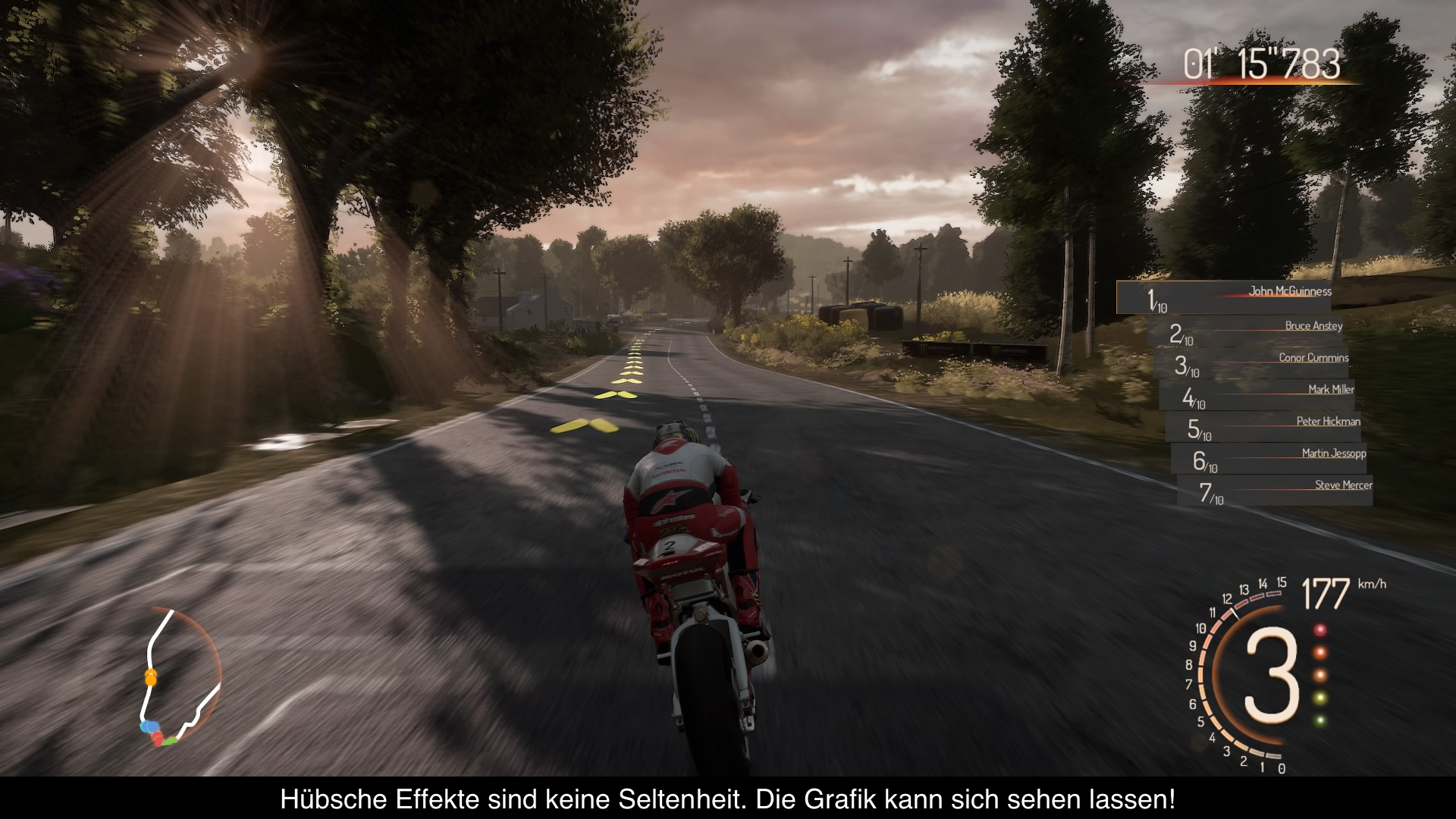 Die Optik von TT Isle of Man hat mich ziemlich überrascht. Sowohl die Motorräder als auch die Umgebungen, die verschiedene Landschaften umfassen, sind gut modelliert und hübsch anzusehen. Noch beeindruckender ist jedoch das Lightning – vor allem wenn man durch dichte Waldgebiete rast und die Sonne durch das Gestrüpp scheint. Auch die Weitsicht verdient ein großes Lob! Schade nur, dass es kein wirkliches Schadensmodell gibt. Was es jedoch gibt, ist ein überragendes Ragdoll-System, welches man bei jedem Crash erlebt, wenn eurer Fahrer auf verschiedene Art durch die Gegend geschleudert wird. Was den Sound angeht, gibt es neben der trostlosen Menümusik nur die standardmäßigen Motorensounds eurer Maschinen. Aber um ehrlich zu sein bin ich froh, dass es während des Rennens keine Songs gibt, da dies nur der Atmosphäre schaden würde.