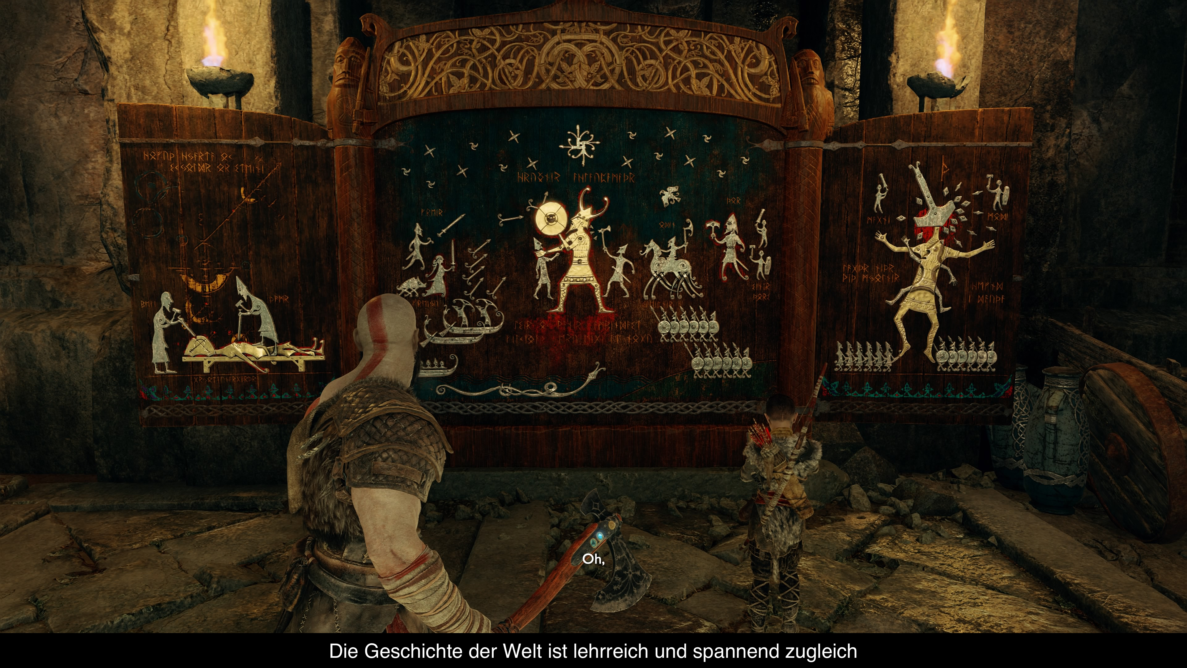 Nachdem Kratos in Griechenland die Götter ausgelöscht hat und ein kleineres Chaos hinterlassen hat, wurde es ihm wohl dort zu langweilig. So zog er weiter, um den Schmerz der Vergangenheit und den Geist von Sparta hinter sich zu lassen und fand im kalten Norden sein Glück. Denn er kam nicht nur zur Ruhe, sondern fand dort auch eine neue Liebe. Aus dieser Liebe entstand mit Atreus sogar ein Sohn und nun steigt das Spiel einige Jahre nach dessen Geburt mit einem traurigen Ereignis ein. Denn Kratos Frau und Atreus Mutter ist tot und ihr letzter Wunsch war, dass sie ihre Asche auf dem höchsten Ort verteilen. Also machen sich beide auf den Weg, um zum Gipfel des Berges in der Nähe zu gelangen. Im Spiel ist aber der Weg das Ziel, denn Kratos und Atreus haben zu Beginn recht wenig gemeinsam. Kratos muss noch in die Vaterrolle hineinwachsen und Atreus hat mit dessen aufbrausenden Art natürlich zu kämpfen. Aus dieser Dynamik entstehen aber zahlreiche unvergessliche Szenen, die mal traurig, mal lustig sind und der Figur von Kratos eine bis dahin ungesehene Tiefe geben. Die Charakterentwicklungen sind nachvollziehbar und zum Teil nicht ganz vorhersehbar. Und wenn ein Grieche plötzlich im Norden auftaucht, der für die Auslöschung der griechischen Götter verantwortlich ist, bleibt das bei den nordischen Göttern natürlich nicht unbemerkt.