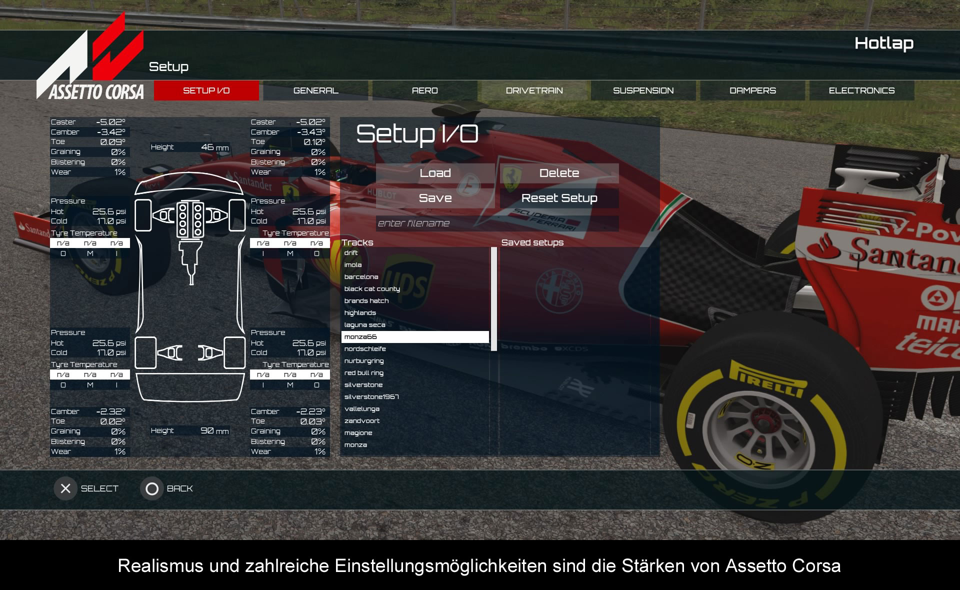 Aber es ist schon ein zweischneidiges Schwert: Zwar habe ich selber kein Lenkrad, aber es bedarf keiner großen Recherche, um zu sehen, dass PS-freudige Zocker, die über ein Lenkrad verfügen, selbst auf der PS4 auf Assetto Corsa schwören. Es scheint den Entwicklern also tatsächlich gelungen zu sein, das realistische Fahrgefühl der PC-Version auf die Konsole zu bringen. Gleichzeitig ziehen Casual-Zocker aber ganz klar den Kürzeren, weswegen man sich schon vor ab vergewissern sollte, worauf es hier ankommt. Da ich leider nur einen Controller habe, hatte ich in den einzelnen Rennen meist kaum eine Chance. Und auch das phänomenale Geschwindigkeitsgefühl, welches man auch auf der PS4 wiederfindet, kommt zu einem hohen Preis, da man sich einfach viel zu oft nach langen Geraden im Kiesbett wiederfindet. Und auch die Gegner sind bockschwer, und verlangen höchste Präzision von einem, um gar nur mithalten zu können. Hinzu kommt ein äußerst striktes Strafsystem, welches euch bei jedem noch so kleinen Ausritt sofort einige Punktabzüge gibt. Alles in allem wurde ich also nie wirklich warm mit dem Gameplay von Assetto Corsa. Und die Präsentation als auch die Modi, zu denen ich in Kürze nochmal komme, haben mich ebenfalls nicht großartig motiviert, Geld in ein Lenkrad zu investieren. Wer jedoch eines besitzt und von Simcade-Racern genug hat, findet in Asseto Corsa definitiv ein Spiel, welches der Hardware eine Daseinsberechtigung verleiht.