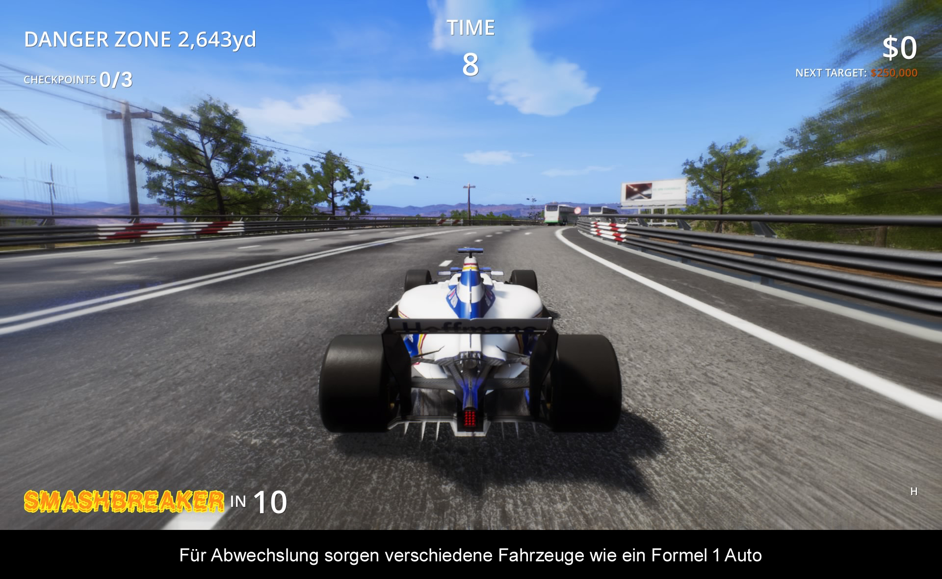 Im Gegensatz zum Vorgänger darf man dieses Mal auf der Autobahn in die Crash-Zone rasen. Vier verschiedene Landschaften stehen zur Auswahl, welche nach und nach freigespielt werden. Euer Hauptziel ist es, mit dem Fahrzeug in die „Danger Zone“ zu kommen und einen möglichst spektakulären Unfall zu verursachen. Leichter gesagt als getan, denn Timing ist hier alles. Auf den Weg dorthin gilt es immer wieder, kleine Aufgaben zu erfüllen, wie eine bestimmte Anzahl von Autos zu rammen, oder möglichst schnell das Ziel zu erreichen. Alle diese Aktionen treiben den Multiplikator in die Höhe, welcher dann den Smashbreaker aktiviert. Mit dieser schönen Funktion kann man sein Auto zu einer Explosion bringen, um dann noch eine größere Karambolage zu erzeugen. So rennt der Multiplikator weiter, bis man die höchste Punktezahl erreicht hat. Natürlich wird man das beste Ergebnis nicht beim ersten Versuch erreichen und so wiederholt man Abschnitt für Abschnitt bis die Erkenntnis kommt, dass es mehr ein Rätselspiel ist, als ein Arcade-Renner. Die Fahrzeuge fahren zum Beispiel alle in einem bestimmten Muster und zu bestimmten Zeiten. Wer also den besten Highscore will, muss sich diese Muster einprägen und den effektivsten Weg auf der Autobahn finden. Hin und wieder gibt es Power-Ups, welche mehr Punkte oder andere Boni bringen, doch am Ende zählt oftmals nur die perfekte Karambolage. Um ein wenig Abwechslung reinzubringen, gibt es kleine Bonus-Missionen. Auf dem Weg zur Crash-Zone muss man, wie erwähnt, bestimmte Fahrzeuge rammen, aber auch Sprünge absolvieren, oder mit dem Sportwagen eine konstante Boost-Strecke hinlegen. Dazu stehen insgesamt acht Fahrzeuge zur Verfügung, inklusive einem mächtigen Truck und einem Formel 1 Wagen.