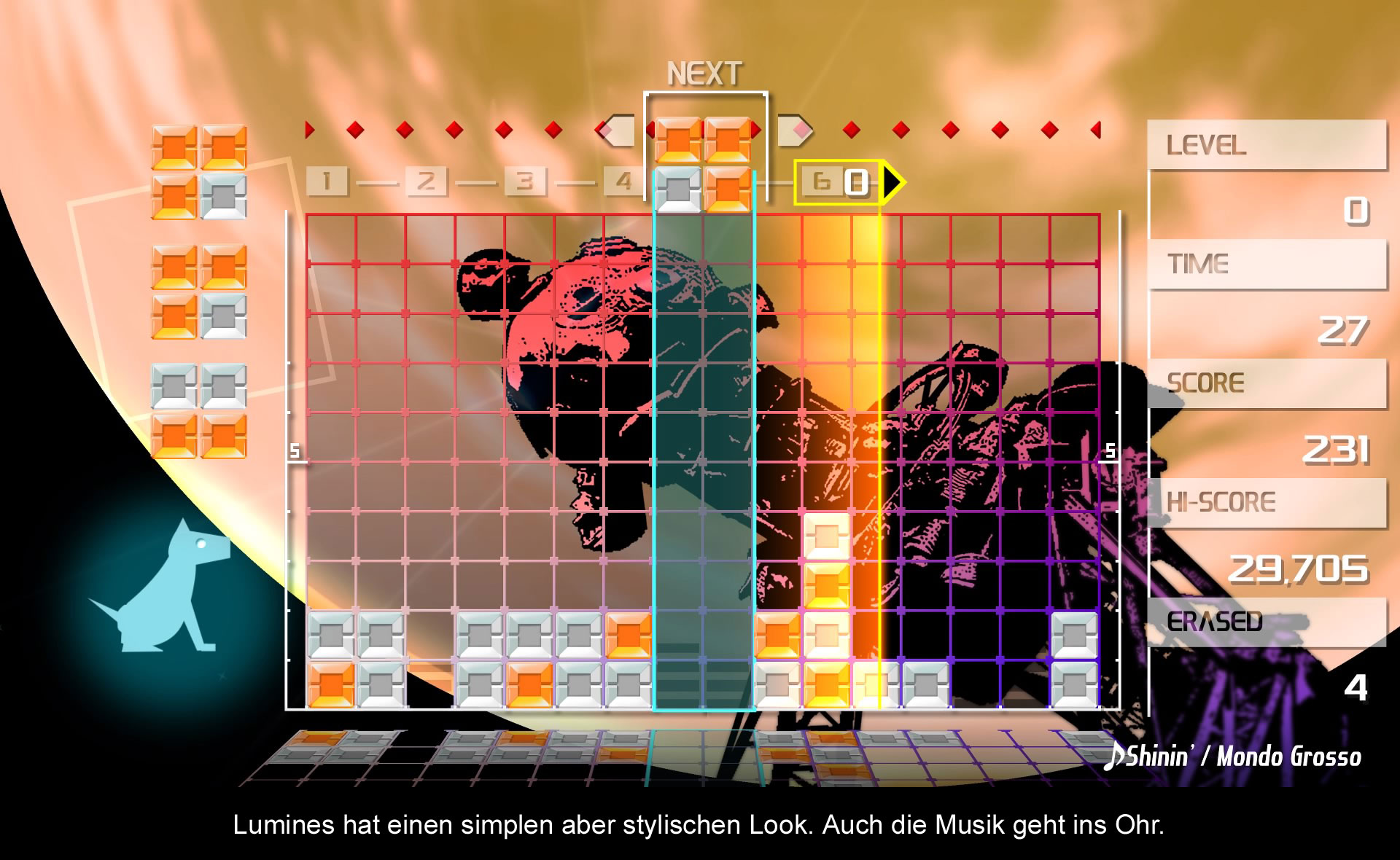 Grundlegend erinnert Lumines natürlich allen voran erstmal an Tetris, wodurch sich jeder Zocker schnell mit dem Spiel zurecht finden wird. Während Blöcke vom oberen Teil des Bildschirms nach unten fallen, geht es im zweiten Schritt darum, sie möglichst so zu platzieren, dass sie sich am Boden wieder auflösen. Statt verschiedener Formen, wie in Tetris gibt es bei Lumines jedoch nur Vierecke, die wiederum aus vier unterschiedlichen Bauklötzchen bestehen. Diese Klötze haben unterschiedliche Farben, und lösen sich nur dann auf, wenn mindestens 4 Farben der gleichen Sorte aufeinanderstoßen. Noch spannender wird das System schließlich durch den sich hin und her bewegenden Pfaden auf dem Bildschirm. Berührt dieses nämlich euern Klötzchen lösen sie sich endgültig auf. Um also möglichst viele Punkte zu sammeln, sollte man möglichst viele gleichfarbige Klötzchen zusammenlegen, ehe sie dann vom Faden aufgelöst werden.